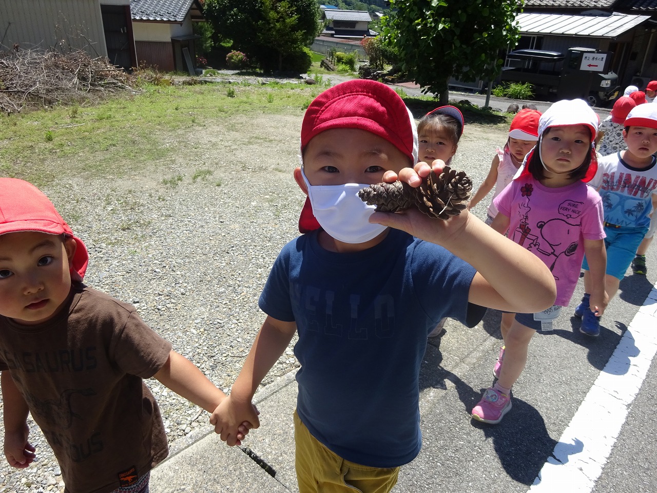 途中で田んぼの中のオタマジャクシを覗き込んでみたり、紫陽花や朴葉を見たりと季節を感じることができました。また、池には鯉がいたので、うれしそうにずっと見つめている子もいました。さすが年中さん、年長さん!「右よし左よし」と安全確認もしっかりして、最後まで元気に歩きました。