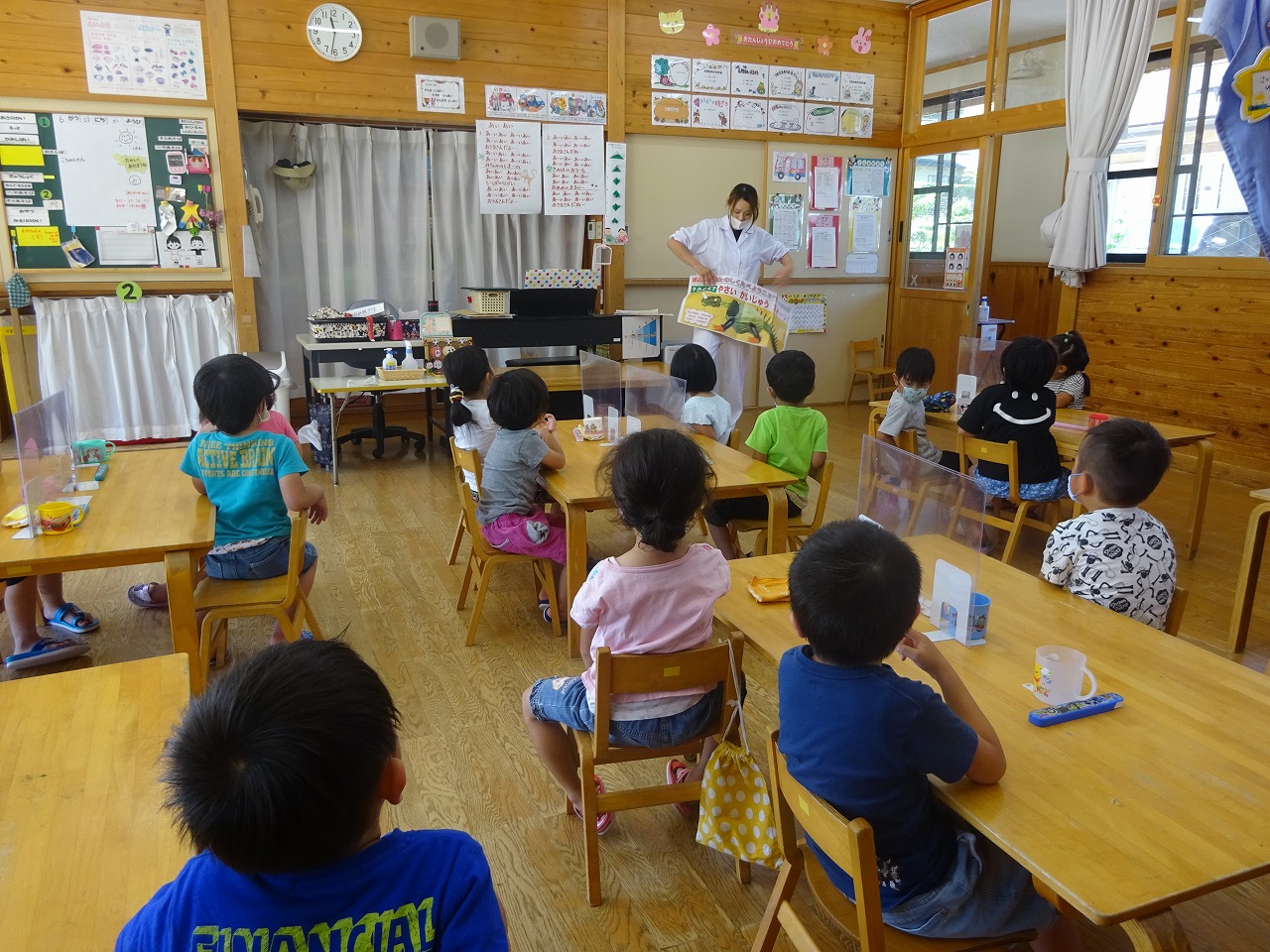 今日は、野菜についてのクイズでした。年少さんは野菜の写真を見て、何の野菜か当てました。年中、年長さんは少し難しく、恐竜の体が野菜で出来ていて、その野菜を当てました。みんな身を乗り出して元気いっぱいに答えていました。