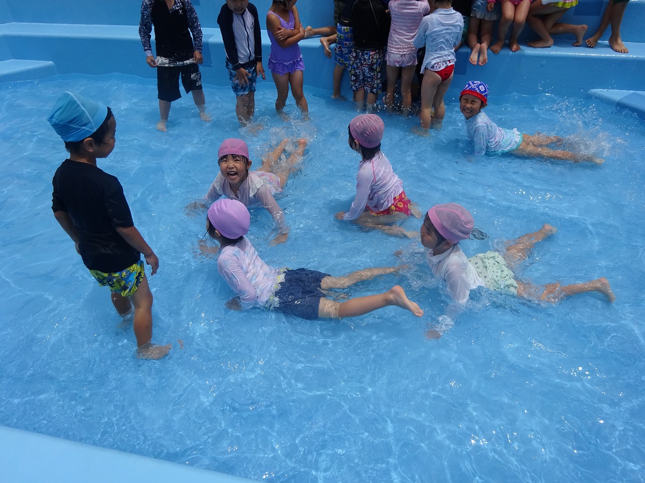 クラスで着替え、遊戯室で体操をしてからプールに入ります。初日の今日は、準備や片付けの仕方を確認しながら行ったのでプールに入る時間は短めでしたが、みんな喜んで入りました。年少さんは初めてなのでとても慎重に歩いていましたが、水鉄砲やおもちゃで遊ぶ時間はとても楽しそうでした。年中さん、年長さんは、去年までの経験があるので、いきなり潜ったり泳いだりできるところを見せてくれ、さすがにダイナミックでした。これからどんどん暑くなって、たくさんプールに入れるのが楽しみです。