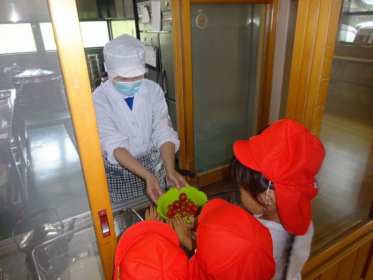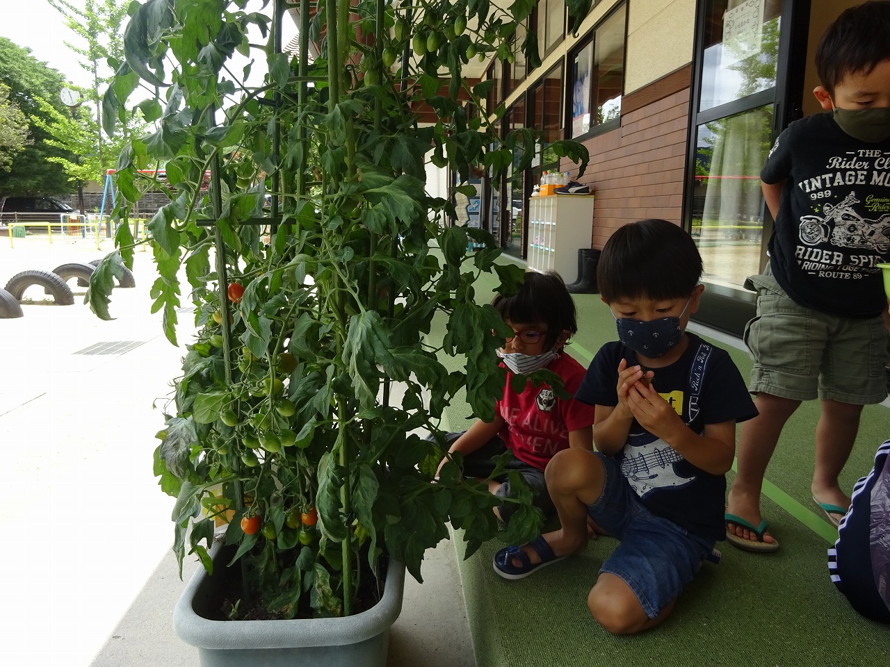 たくさん収穫できる日もあれば、ちょっとだけの日もありますが、順番に採って食べています。収穫したトマトは「洗ってください」と給食室へ持って行き、給食の先生が洗ったり切ったりしてくれます。トマト大好きな子は「おいし〜い!もっと食べた〜い!」ちょっぴり苦手な子も「こども園のは甘くておいしい」と言って喜んで食べています。次の順番を楽しみに待っている子どもたちです。