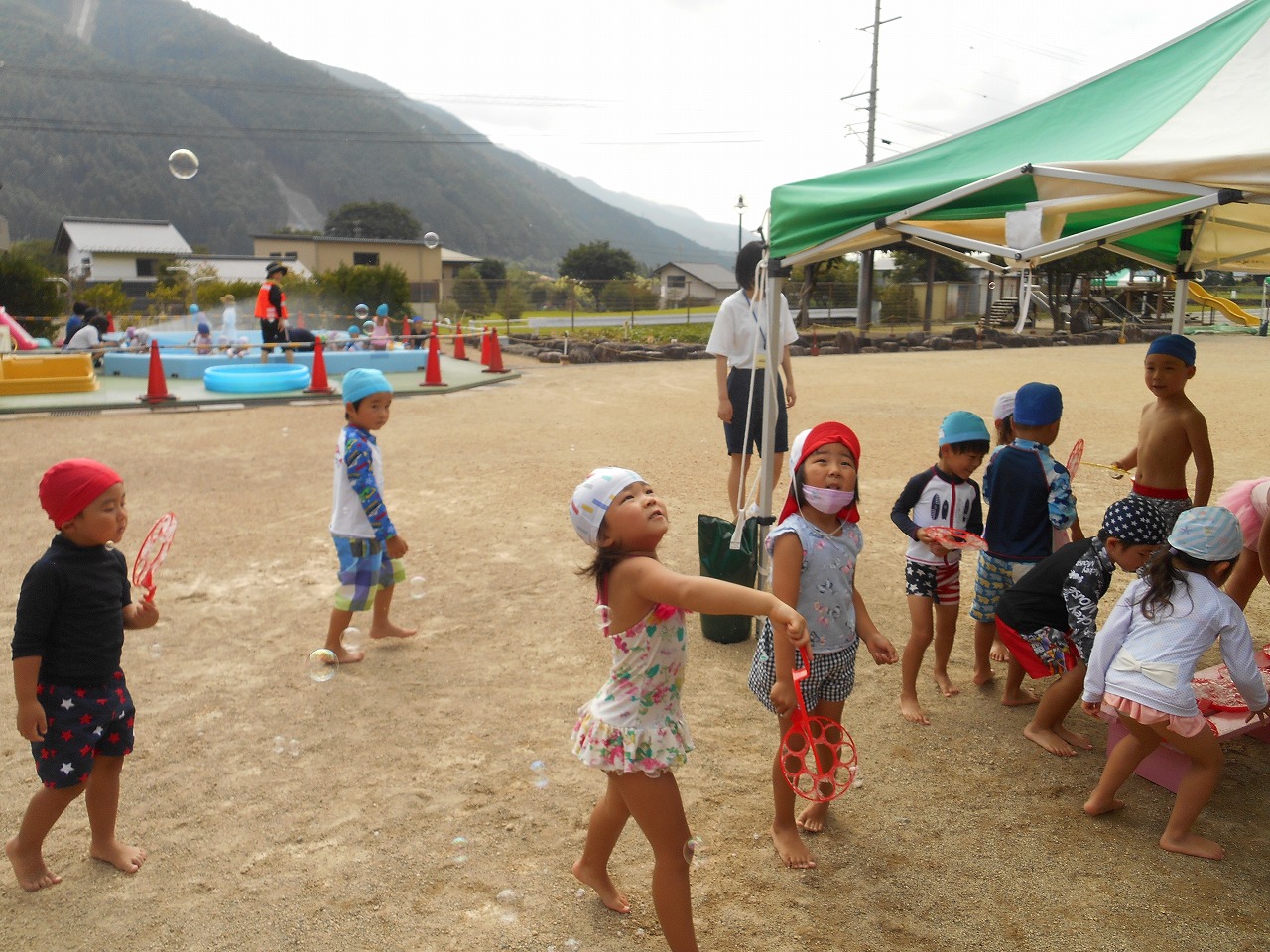 年中さんがシャボン玉あそびをしました。今回は、ストロータイプの道具は使わず、バブルリングを使いました。