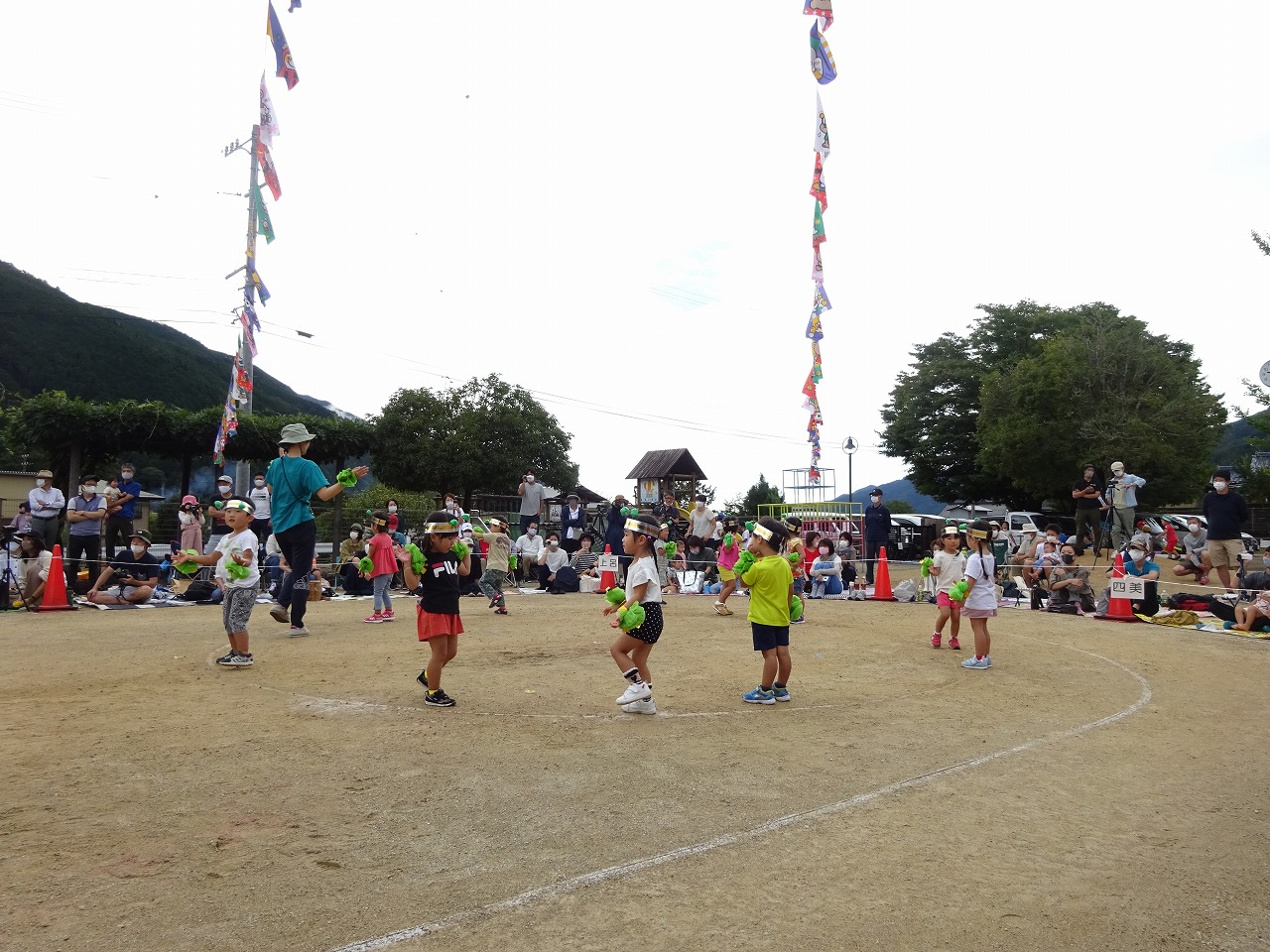 また、かけっこでは相手の子を待ちながら走ったり、思い切り内回りをしてあっという間に終わってしまったりと年少さんらしい微笑ましい姿も見られました。暑い中最後までよく頑張りましたね。