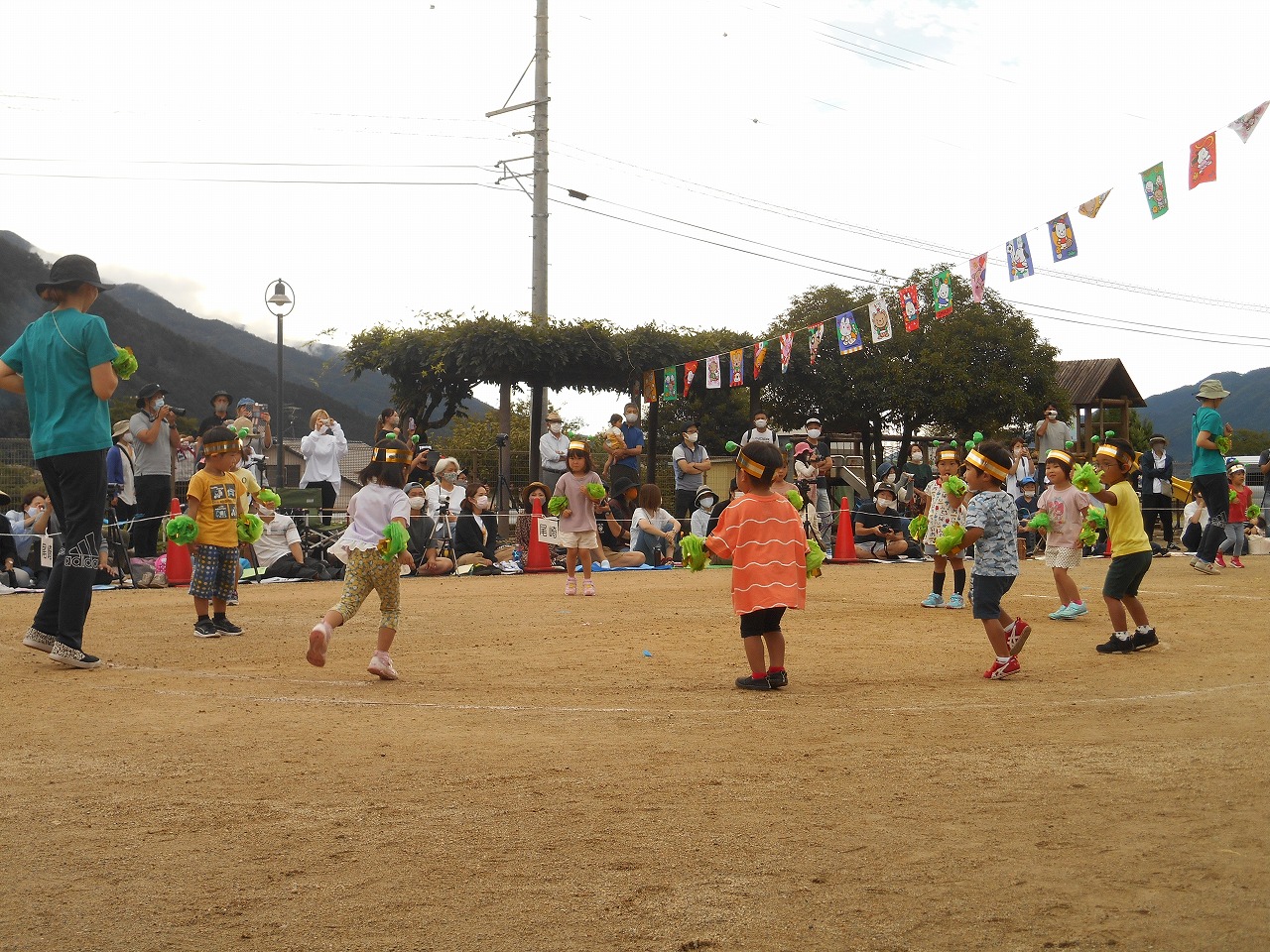 初めての運動会だった年少さん。たくさんのお客様にびっくりしながらもいつも通りのかわいい笑顔で遊戯を見せてくれました。