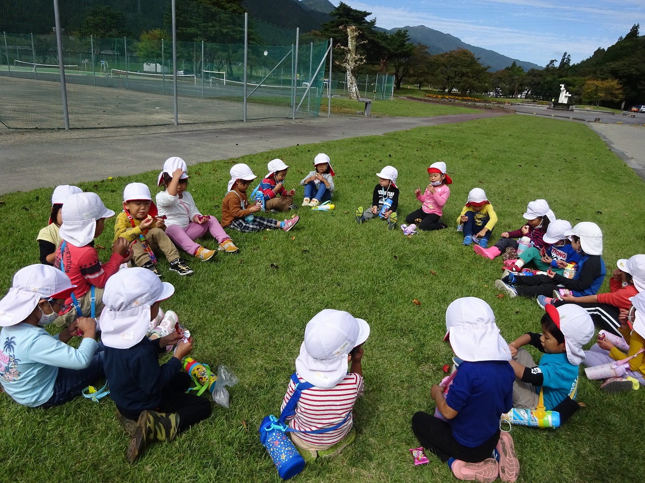年長さんは行きは歩きで、1時間以上かけて頑張りました。弱音をはくことなく余裕の笑顔で到着した子どもたち。就学へ向けて大きな自信になりました。「菓子食い競争」をしておやつを食べた後は芝生の斜面を段ボールを敷いて滑って遊びました。「まだ帰りたくな〜い」「また来た〜い」と楽しさが伝わってきました。このような機会を与えてくだった飛騨川公園のみなさん、ありがとうございました。