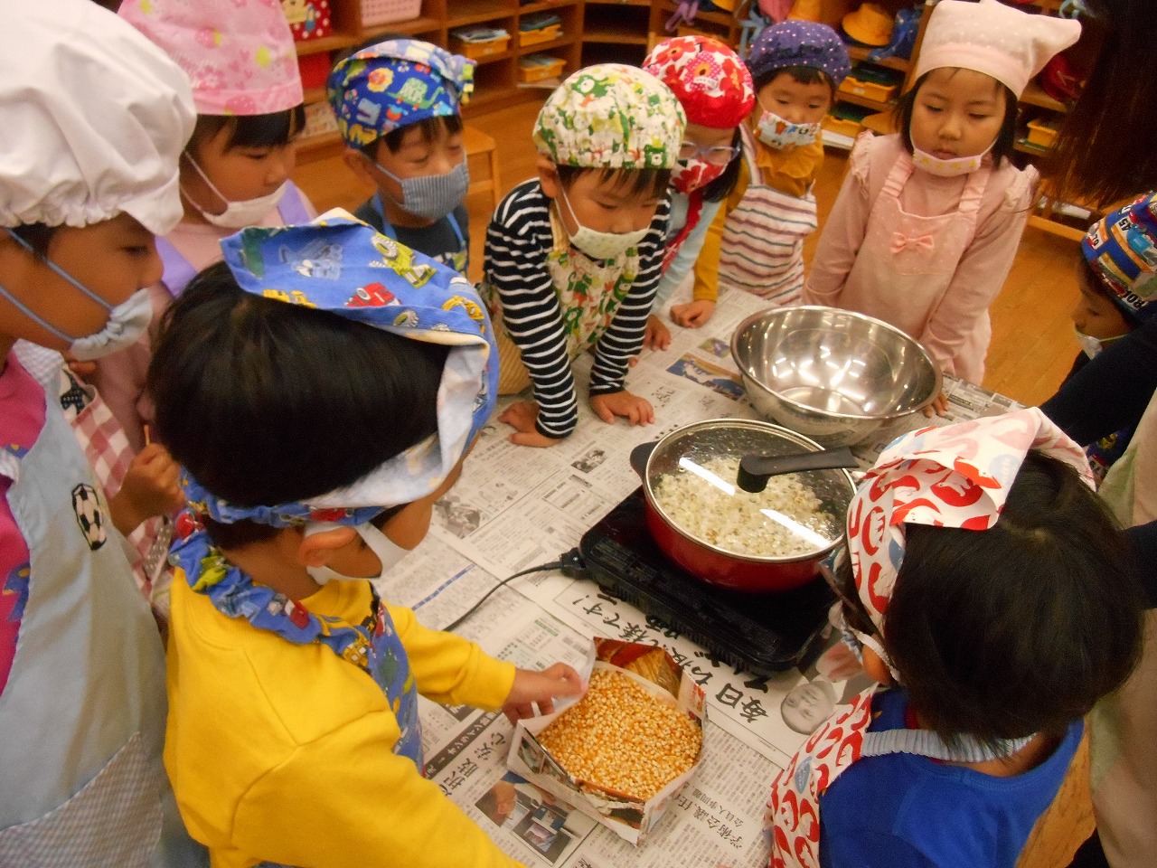油たっぷりのフライパンの中でポンポン弾けるポップコーンを見て大興奮のさくら組さん。そして、さくら組から漂ってくるポップコーンの香ばしい香りに他の学年の子どもたちも大興奮です。自分たちで育てたトウモロコシの味は格別だったようで「おいし〜い」と満々の笑みで食べました。ちゃ〜んと他のクラスにもおすそ分けをしてくれた優しいさくら組さんです。持ち帰ったトウモロコシでお家でもぜひ楽しんでね。