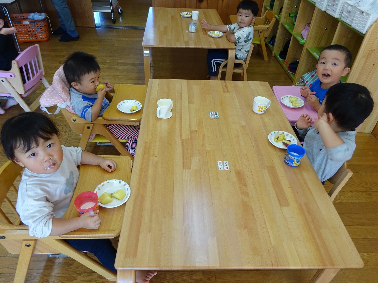 「このお芋はどこで掘れたお芋でしょうか?」「飛騨川公園!」とすぐに正解でした。子どもたちも楽しみにしていたようです。「あま〜い」「おいし〜い」と大喜びで食べました。こども園の芋掘り、焼き芋も楽しみです。