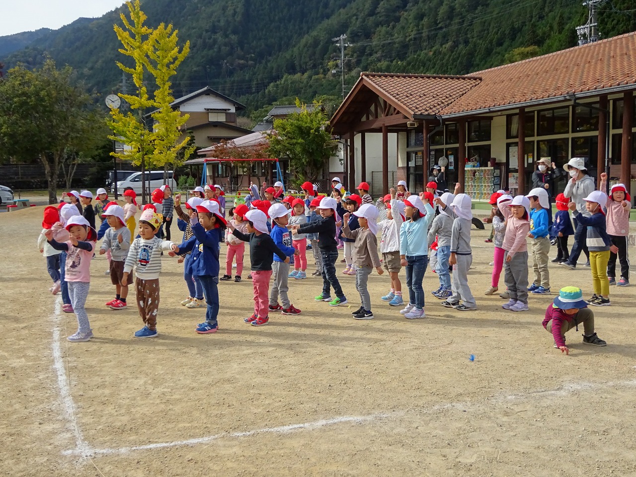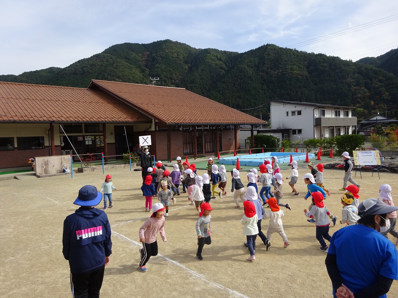 インタビューのあとはみんなで体操をし「おたのしみ」は○×ゲームを行いました。「今日の給食は栗ごはんである」「きたこども園の園長先生はみどり先生である」などのクイズがあり、子どもたちは「かんた〜ん」と言いながら移動していました。最後は「フラフープをたくさん回せるのは」という問題で、先生二人のフラフープ対決が行われました。勝者は・・・一番難しいクイズとなりました。
