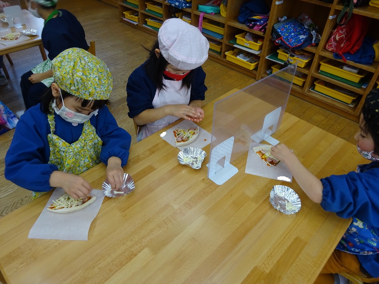 今日のおやつはピザ。年長さんは自分の分を手づくりしました。生地にトマトソースを塗り、具をトッピングしました。チーズもたっぷりのせてできあがり!