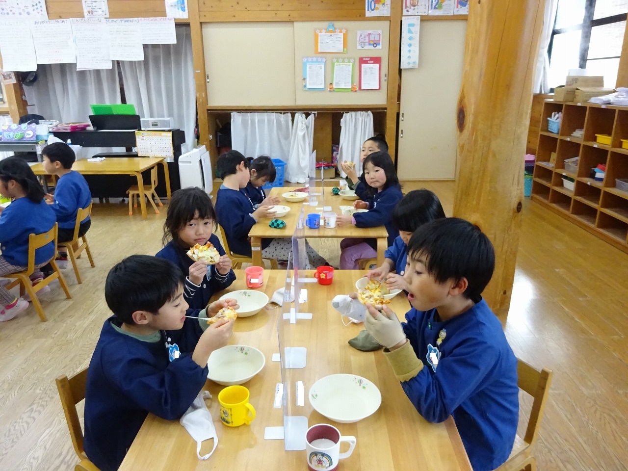 それをオーブンで焼いてもらい、おやつには焼きたてのピザをいただきました。やっぱり手づくりの味は最高です。「美味しい!」を連発しながら幸せいっぱいの年長さんでした。