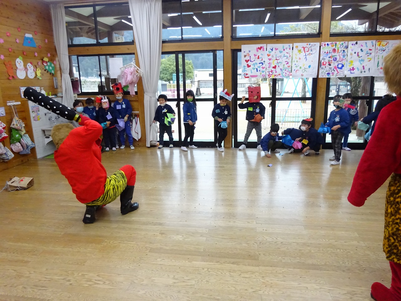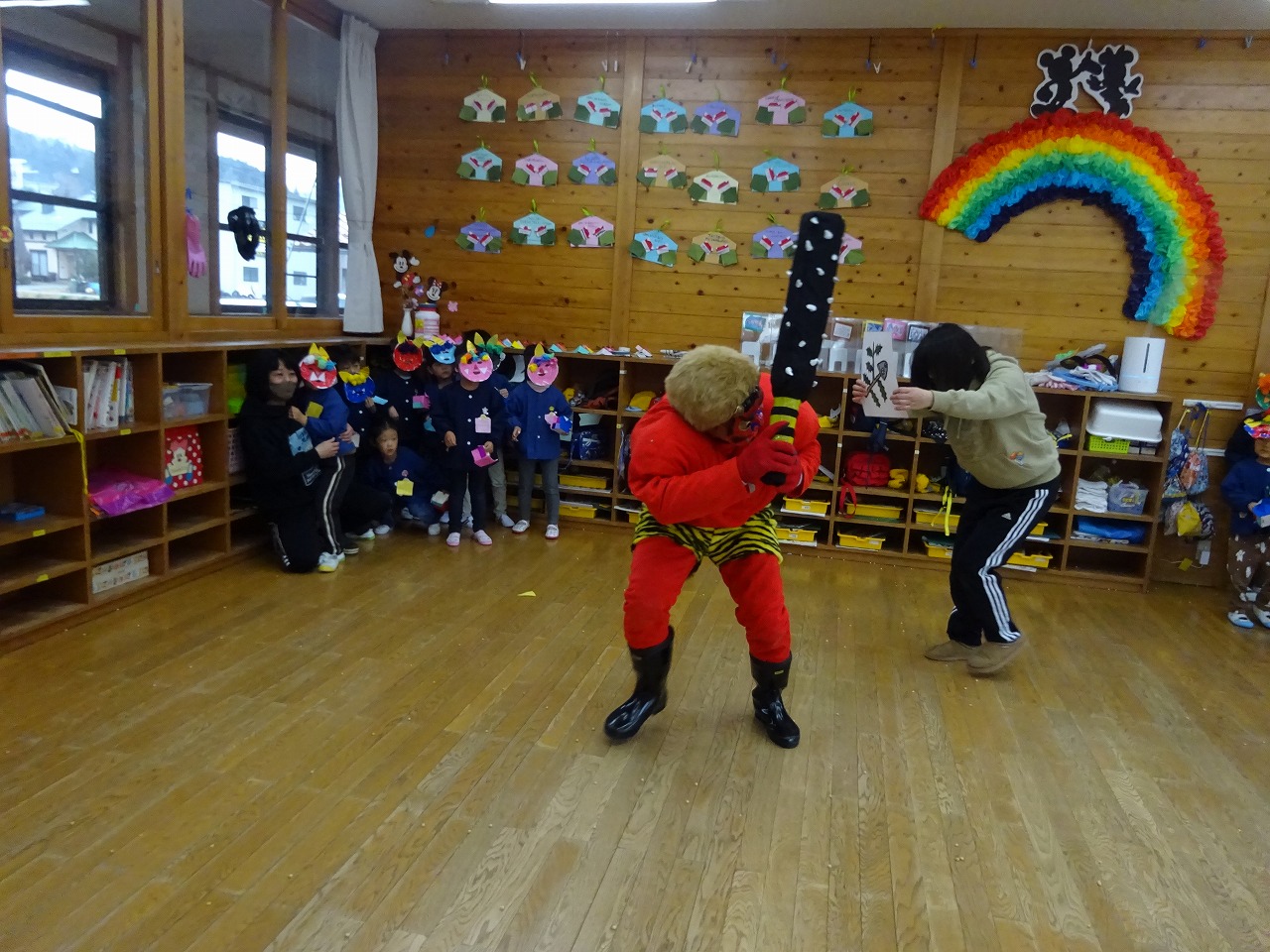 そしていよいよ鬼の登場です。みんな怖い気持ちを我慢して、頑張って豆を投げました。先生に抱っこされる未満児さん、部屋の隅に集まる年少さん、全力で逃げ回る年中さん、お面や豆箱が壊れても立ち向かう年長さん。