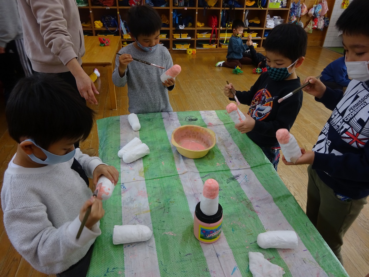 年少組・年中組は紙粘土を使って作り、年長組は、ヨーヨー釣りで使う風船に紙を何層も張って作っていきます。どのひな人形も一日ではできない根気のいる作業ですが、みんな完成を楽しみに毎日少しずつ取り組んでいます。