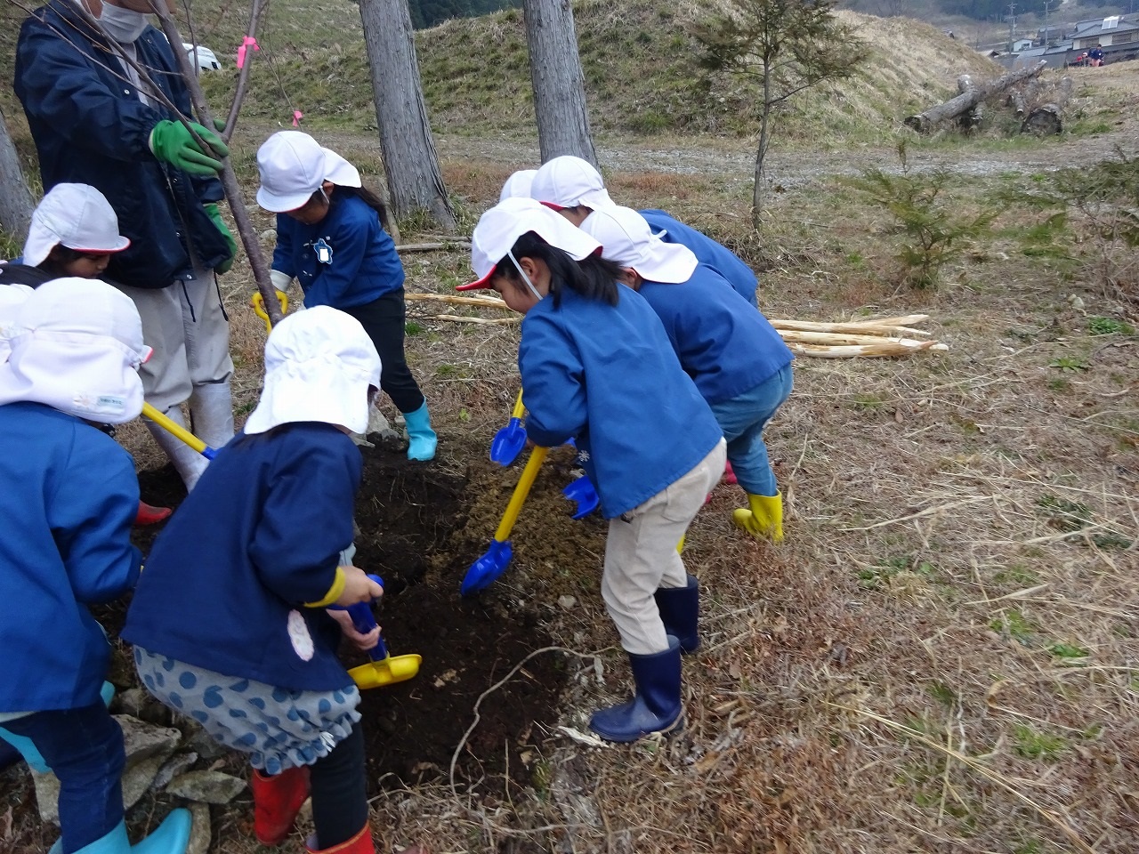 年長さんが『もりのようちえん』へ行き、毎年恒例の卒園記念植樹をしました。