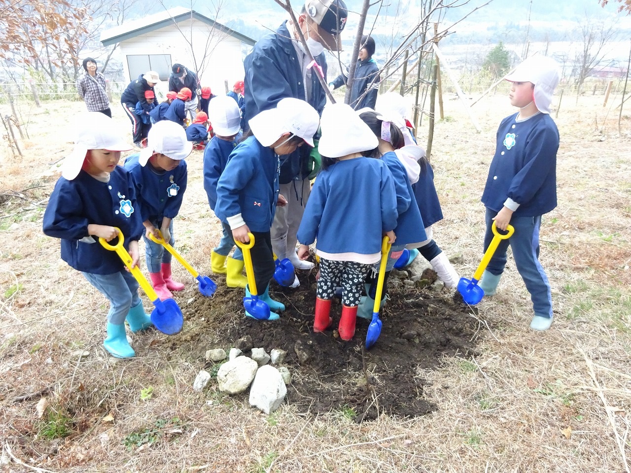 今年は山桜の木を2本植えました。穴を掘って木を埋めると、土をかぶせてみんなで踏み固めました。「何年経ったら花が咲くかな」「小学校へ行ってからもまた見に来るよ」と楽しみに会話をしながら植えました。 年中組のみんなも植樹の様子を見たいと一緒に来ていたので、みんなでしばらく遊んでから帰りました。
