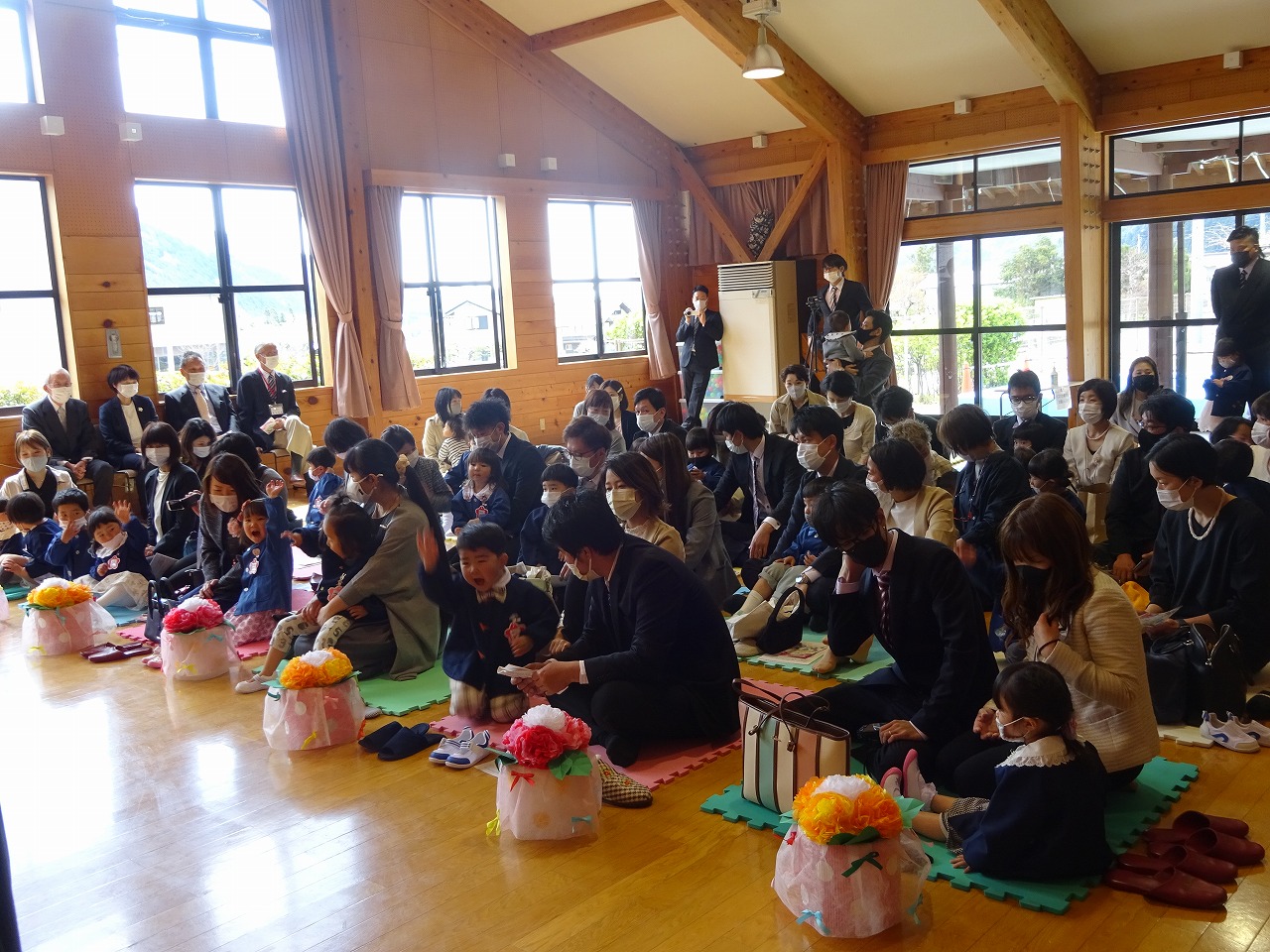 入園式には年少組22名、未満児組9名が参加してくれました。名前を呼ばれると元気に返事をしてステージに上がりアンパンマン体操を踊りました。明日からはおうちの方から離れて集団生活が始まります。ちょっぴりさみしいけれど早くこども園の楽しさを知って喜んで登園してくれるとうれしいです。