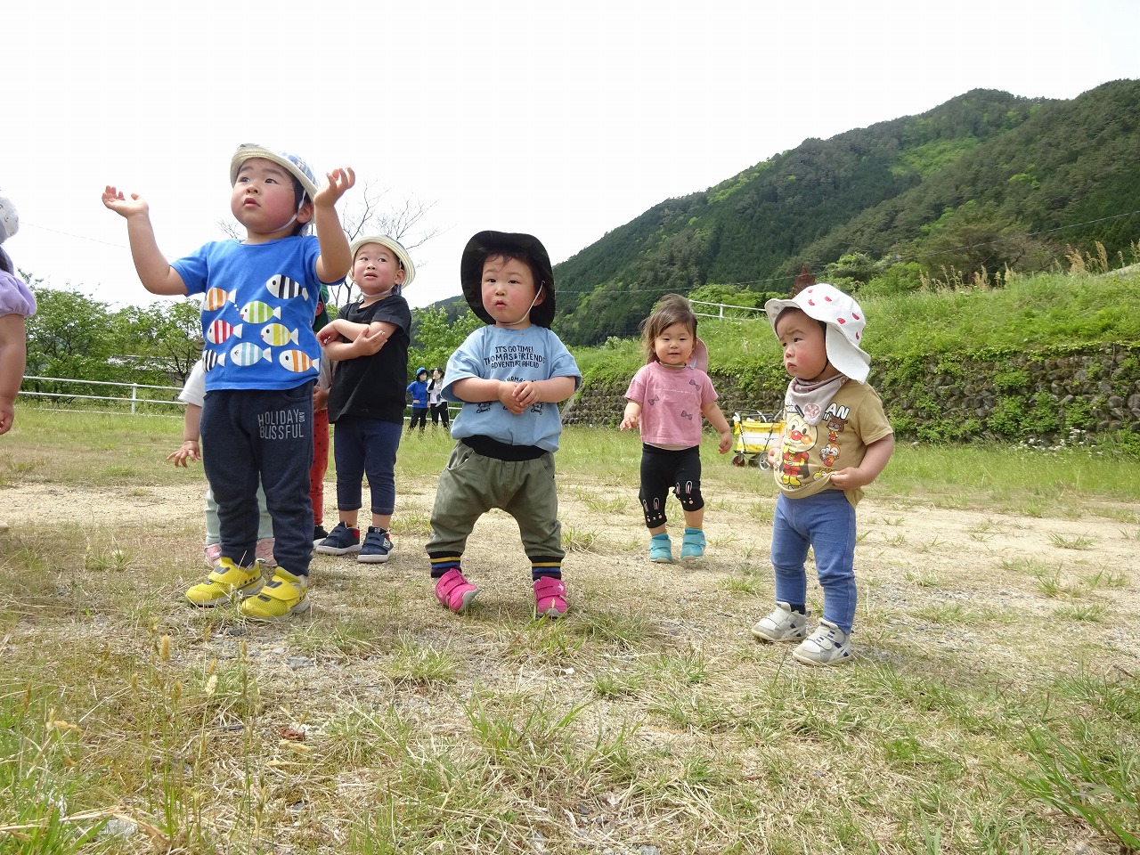 広場では、草花を見つけて「きれいだね」と話したり、「タンポポないかなぁ」と探したり、可愛い姿がたくさん見られました。また途中、ヘリコプターが空を飛んでいるのを見つけて大喜び!「お〜い」「ばいば〜い」とみんなで手を振りました。