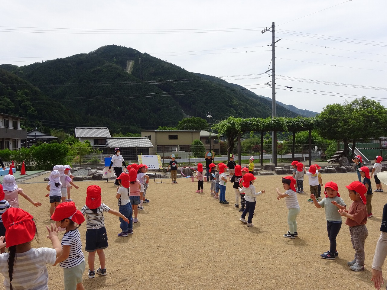 みんなでディズニー体操をした後のお楽しみは〇×クイズ。みんなが知っているアンパンマンのクイズや、今日の給食についてのクイズは子どもたちにとっては簡単だったようですが、難しかったのは、先生たちのフラフープ競争の勝者を予想するクイズです。みんなでいっぱい応援して盛り上がりました。梅雨の晴れ間の良い天気に恵まれ、みんなで楽しい時間を過ごすことができました。