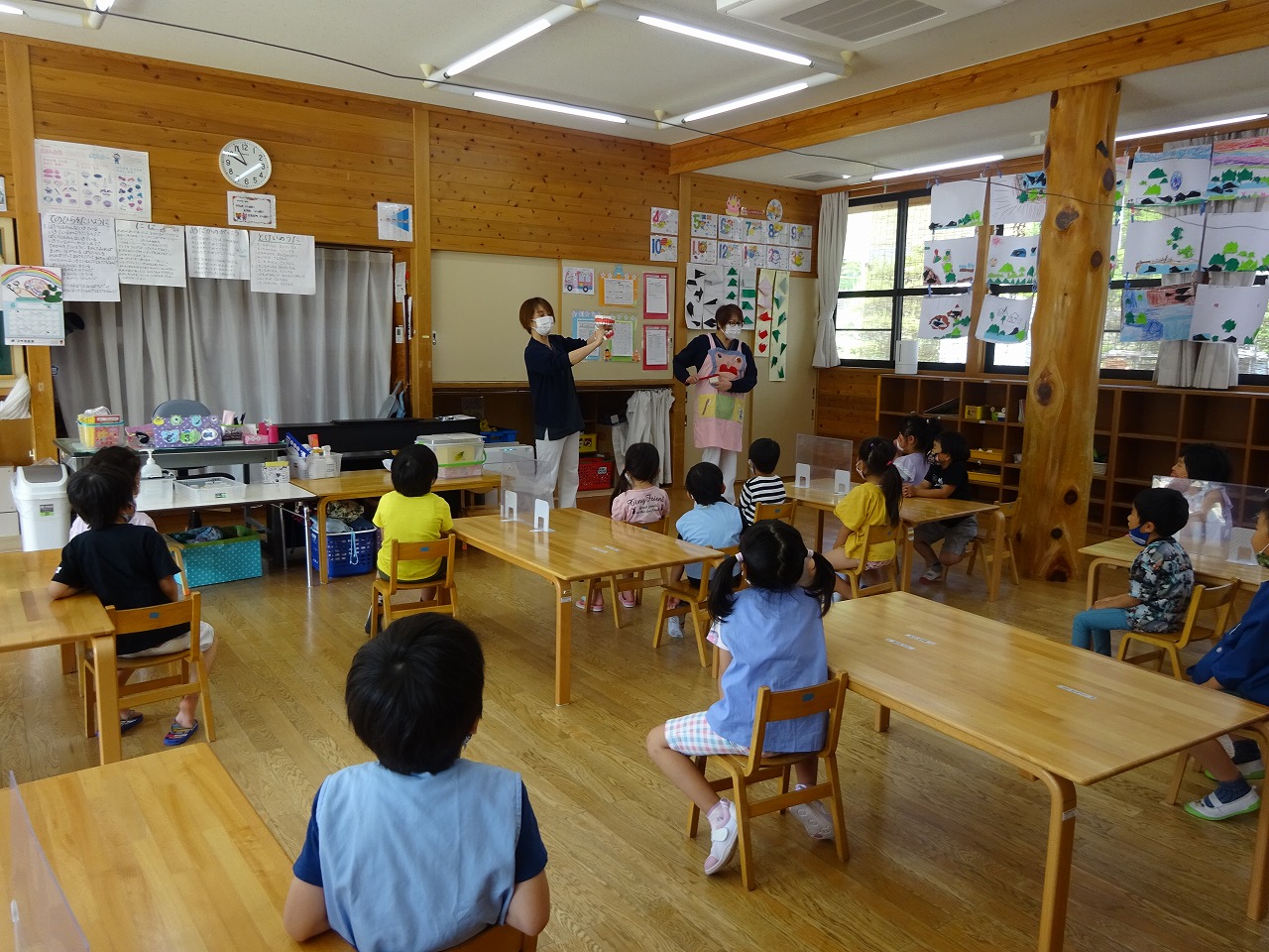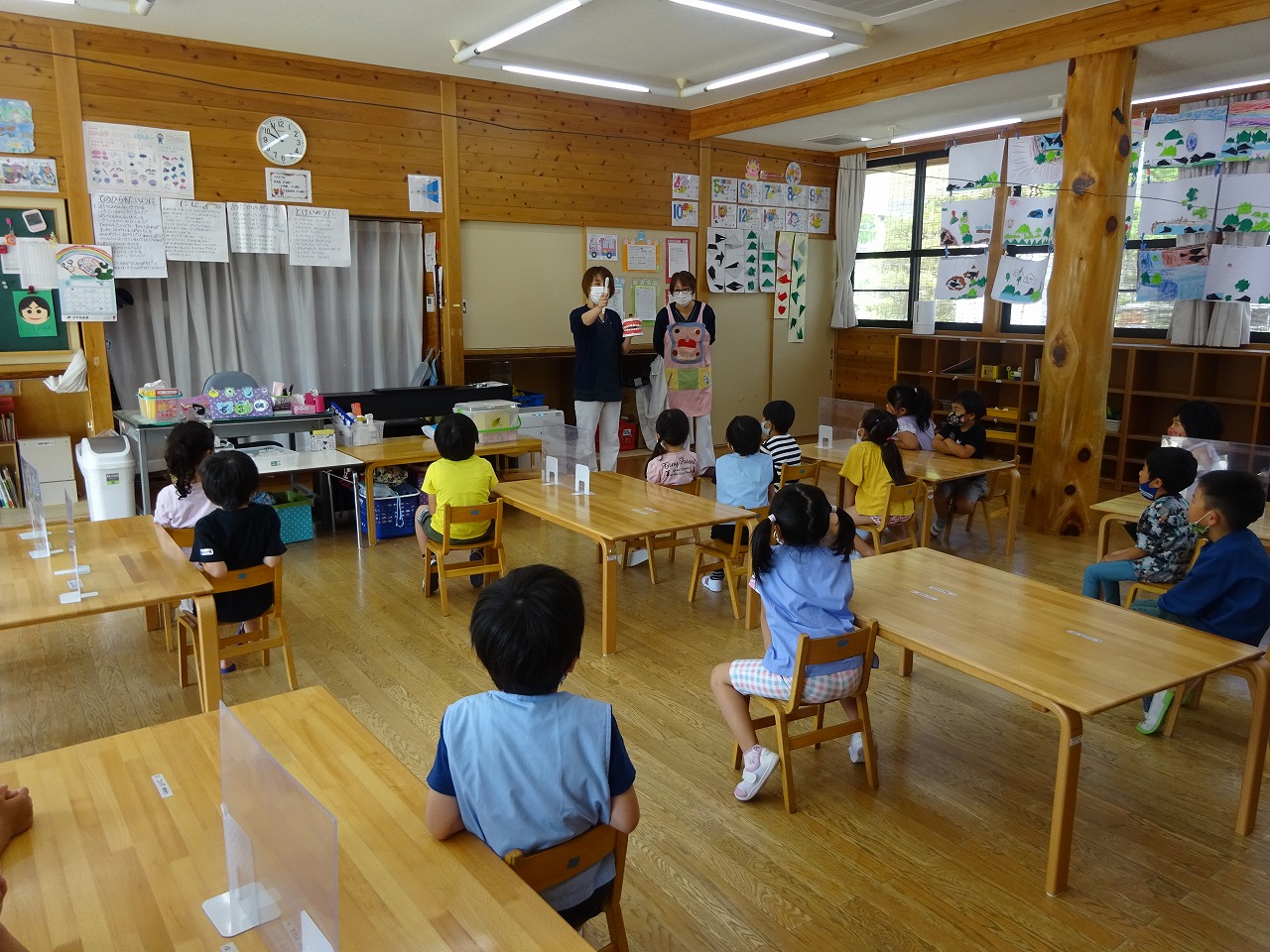 歯みがきをしないカバくんのエプロンシアターを見ながら「ちゃんとみがいてない」「甘いもの食べすぎ」と反応していた年長さんです。今回は、染め出しや実際に歯をみがくことができず残念でしたが、歯ブラシのプレゼントをいただき「がんばって歯みがきする!」と張り切っていました。