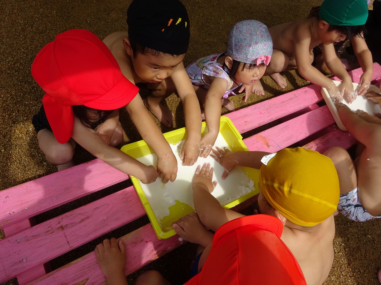 年少さんが片栗粉あそびをしました。まずは、そのままの片栗粉を触って「さらさら〜」と感触を味わいました。