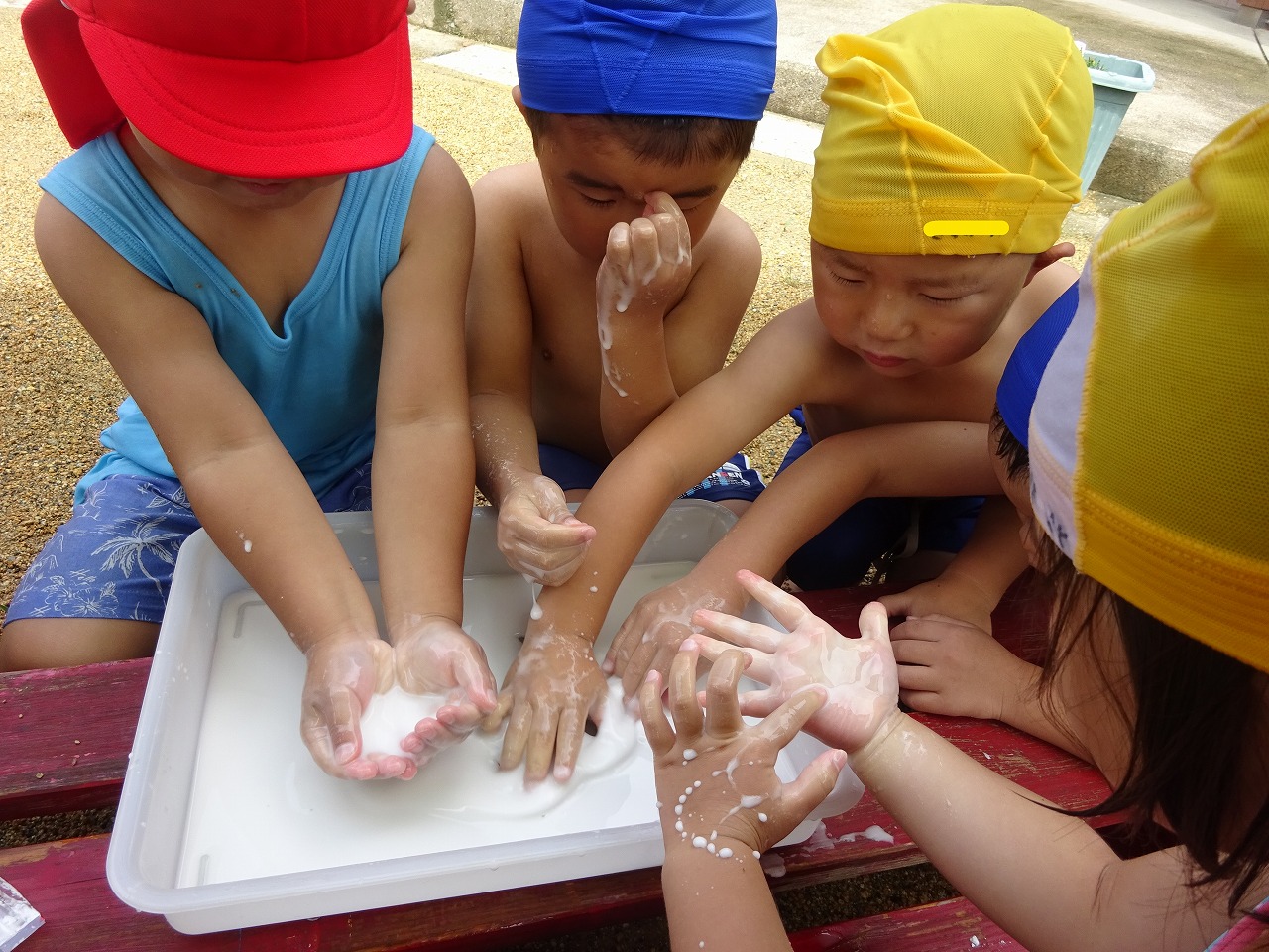 そのあと少しずつ水を加えていくと「ムニュムニュしてきた〜」「おもしろ〜い」と目を輝かせる子どもたち。握って固まった片栗粉が、手を開くとトロリと溶け出す不思議な感触を何度も繰り返し楽しんでいました。それを見に来た他の学年の友だちも「楽しそう!」と集まってきて、順番に触って大喜びでした。