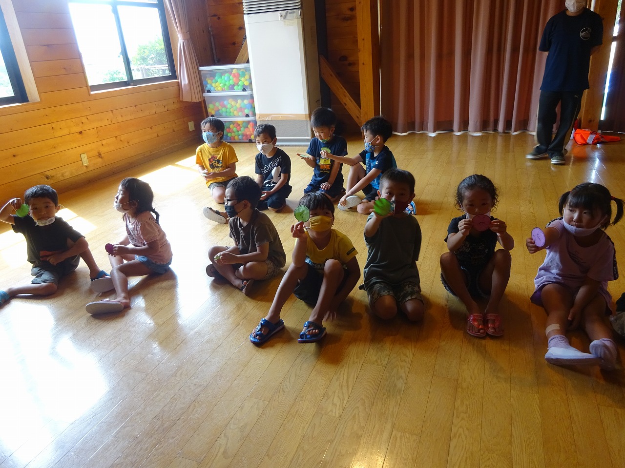 大きくなったら、エルサになりたい!アイドルになりたい!と夢を発表してくれた後はお楽しみの時間。今日は、暑い夏にピッタリの(?)勇気だめし(肝だめし)を行いました。薄暗いステージをよく見ると、三つ目小僧やろくろっ首が・・・子どもたちは、やる前は「こわ〜い」と言っていましたが、無事出口に到着すると勇気のしるしのカードをもらい「ぜんぜん怖くな〜い」「もう一回やりたい」と元気いっぱいでした。