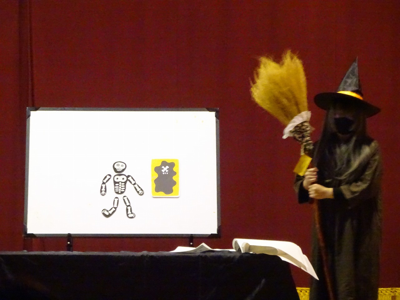 今月はハロウィンにちなみ「おばけマンション探検ツアー」のペープサートを観ました。案内人の魔女と一緒におばけマンションを探検!みんなで「トントントン」とドアをノックしていろんな部屋をのぞいてみました。時々魔女が子どもたちのところへ出張すると「こわい〜」と友だちにくっつく子もいれば、大喜びで魔女に触る子もいて 楽しい時間を過ごしました。