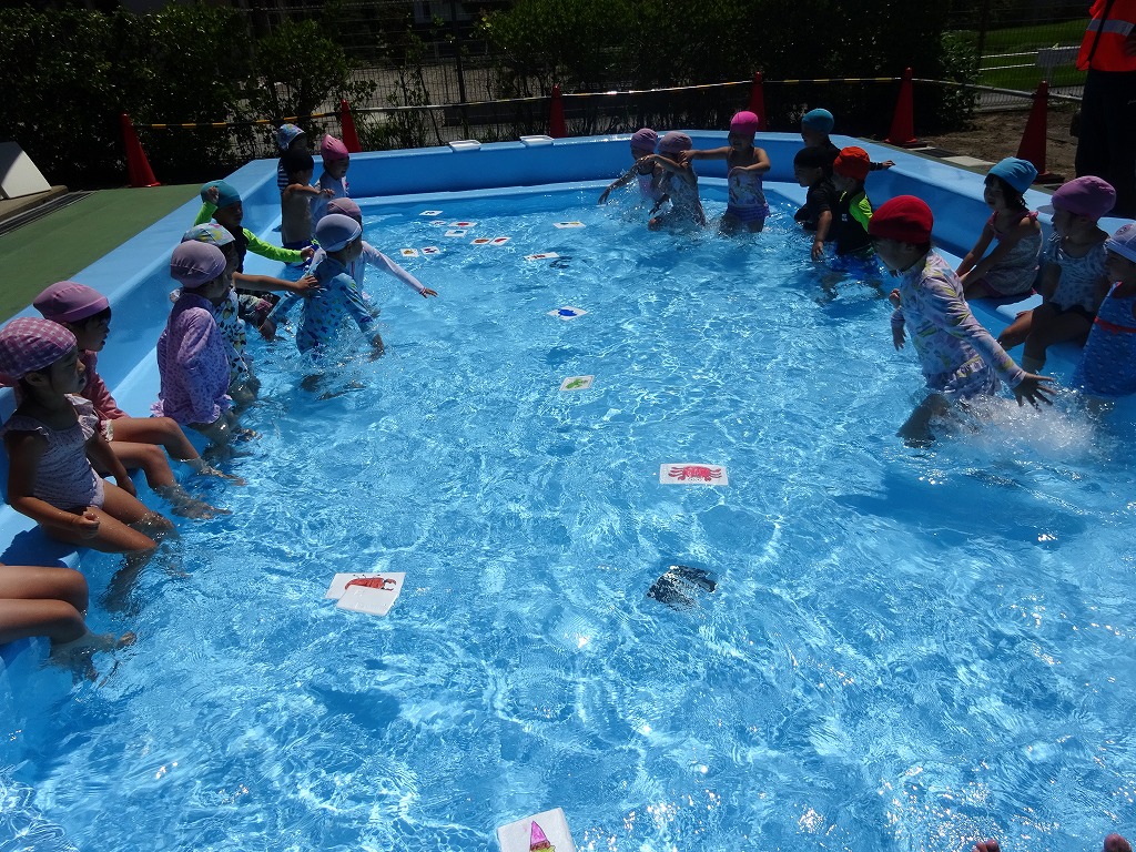 年中、年長さんはプールで誕生会をしました。お日様の光がプールに反射して夏らしくとっても涼しげでした。お楽しみは水中カルタ取りを行いました。顔に水がかかっても平気でプールに浮かぶ絵札を一生懸命探していました。