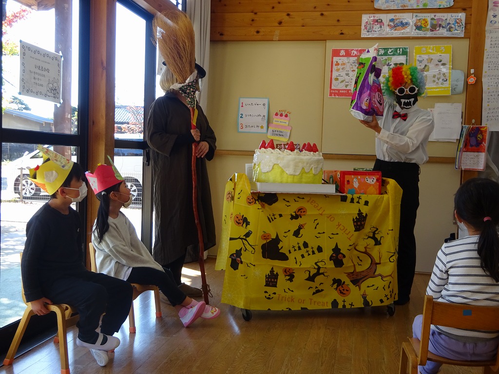 10月はハロウィンがあります。なので今月のお楽しみは・・・魔女のグリーンとその弟子のレインボーが各クラスにプレゼントを届けに来てくれました。しかしプレゼントが消えてしまい空の袋だけになってしまうハプニングが起こってしまいましたが、グリーンとレインボーと一緒に「チチンプイプイのパ!」とおまじないをかけるとプレゼントが現れ一安心。リボンをほどくとかわいいハロウィンのおばけが飛び出し大喜び。ひとつづつプレゼントをもらい、おばけをとばして楽しみました。