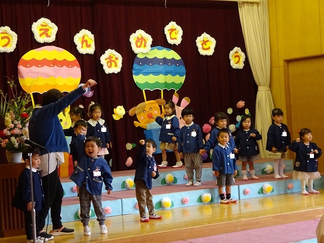 新入園児の年少さん、ちょっぴりドキドキした様子が見られましたがお家の人と一緒に入園式に参加してくれました。人形劇を観た後、名前を呼ばれるとハーイ!と元気に返事をしてステージに上がる子もいてびっくりしました。ステージでは元気にアンパンマン体操を踊ってみせてくれました。