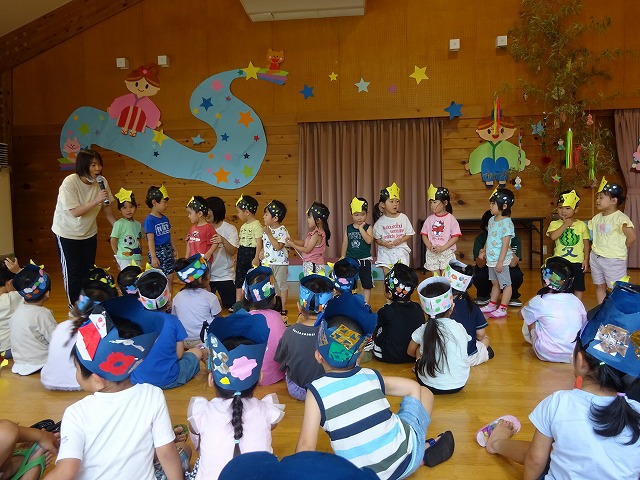 その後各クラスで作った七夕かんむりを子どもたちが紹介してくれました。得意気に発表してくれる姿はとてもステキでした。 今年の七夕のおたのしみは杉山修さん七夕コンサート。歌ったり踊ったりととても楽しいお話で盛り上がり、最後は七夕の歌をギター演奏でみんなで大合唱。とてもステキな会となりました。