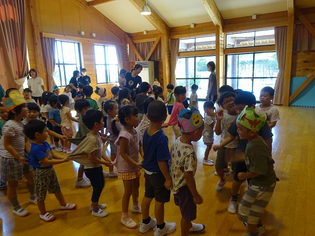 今日のお楽しみはじゃんけん列車を全園児で行いました。違うクラスのお友達とじゃんけんすることにドキドキ・ワクワクしながら向かう表情がとってもかわいかったです。チャンピオンは年長さん9月生まれのお友だちでした。毎日帰りの会で取り入れているじゃんけん列車ですが、クラスで行う時の3倍長い列車が完成し、嬉しそうな子ども達でした。ちゅうりっぷ組さんもクラスのお友だちと繋がって列車になり、上手に歩くことができていましたよ。