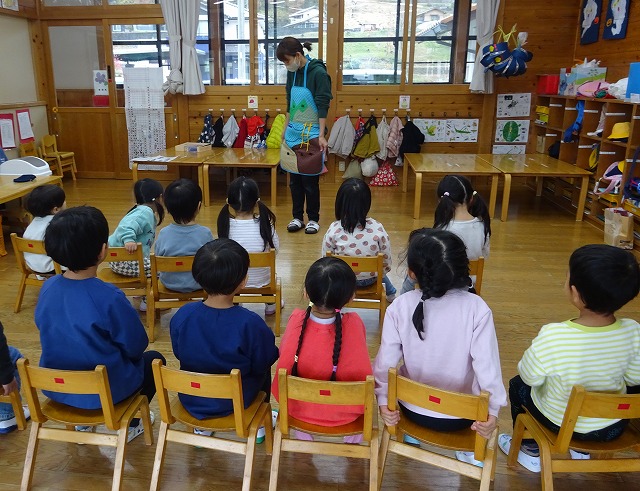 今月は各クラスで誕生会を行いました。誕生日の友だちがいないクラスもお楽しみのエプロンシアター「3匹のヤギのガラガラドン」を楽しみました。トロルが出てくるシーンはみんなハラハラドキドキ。「こわ〜い」と言いながらも前のめりになって真剣に見ている姿がとてもかわいかったです。