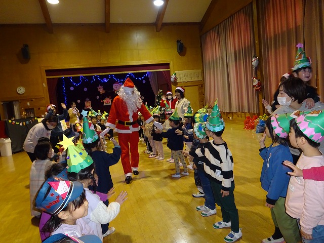 久しぶりに全園児でのクリスマス会。朝から流れるクリスマスソングに子どもたちもワクワク。会が始まってしばらくするとどこからか鈴の音が・・・そしてサンタさん登場!子どもたちのキラキラした表情がかわいかったです。