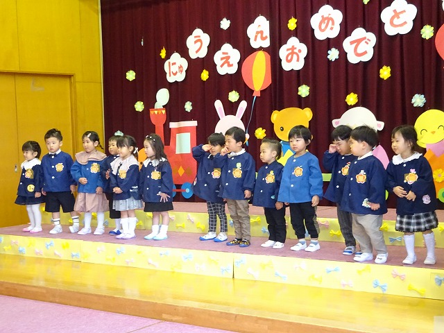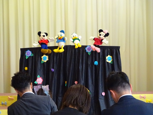 新しい名札、新しい保育室にワクワクドキドキした様子でしたが、久しぶりに会えた友達と会話も弾み、楽しそうな年長、年中、未満児さん。また、新入園児の年少さん、未満児さんは、お家の人と一緒に人形劇を観て楽しんでくれました。その後名前を呼ばれると、元気に返事をしてステージに上がれる子もいてびっくりしました。
