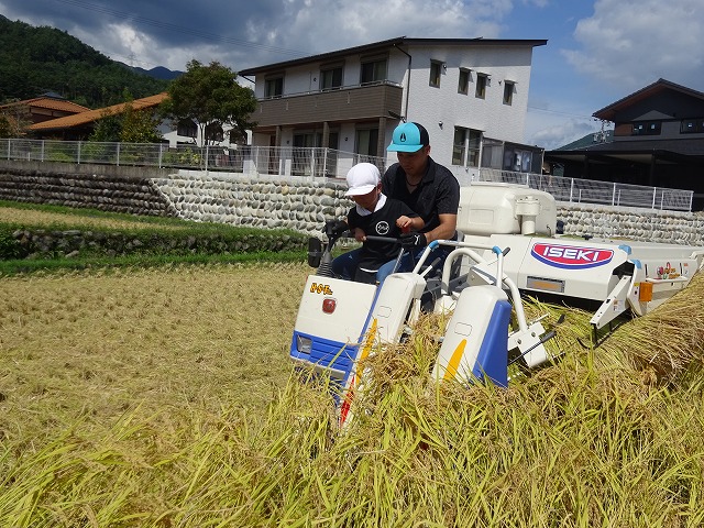 年長児が春に田植えを体験させていただいた小さな苗が、立派な稲穂へと生長し収穫の時を迎え、今回は稲刈り体験をさせてもらいました。お米がどこにあるのか、実際に触ってお米の固さやもみを剥いて色を確かめたりと普段食べているごはんになる前のお米との違いを知ることができました。 また、一人ひとりコンバインに乗せてもらい、収穫体験。あっという間に刈りとらえる稲に驚く子ども達でした。