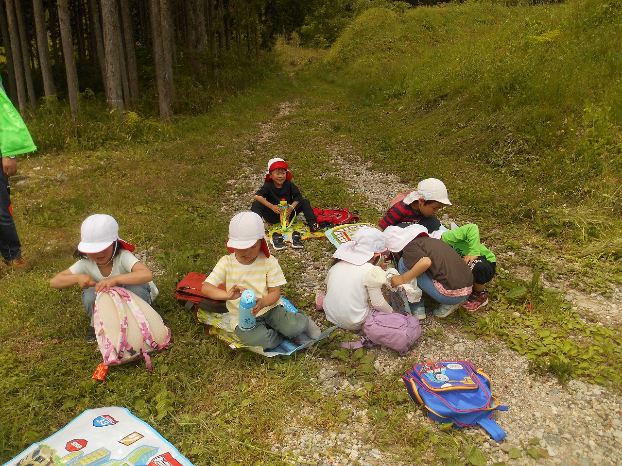 今回の遠足は学年ごとに違う場所に行くことにしました。年長さんは「森のようちえん」に行きました。 |