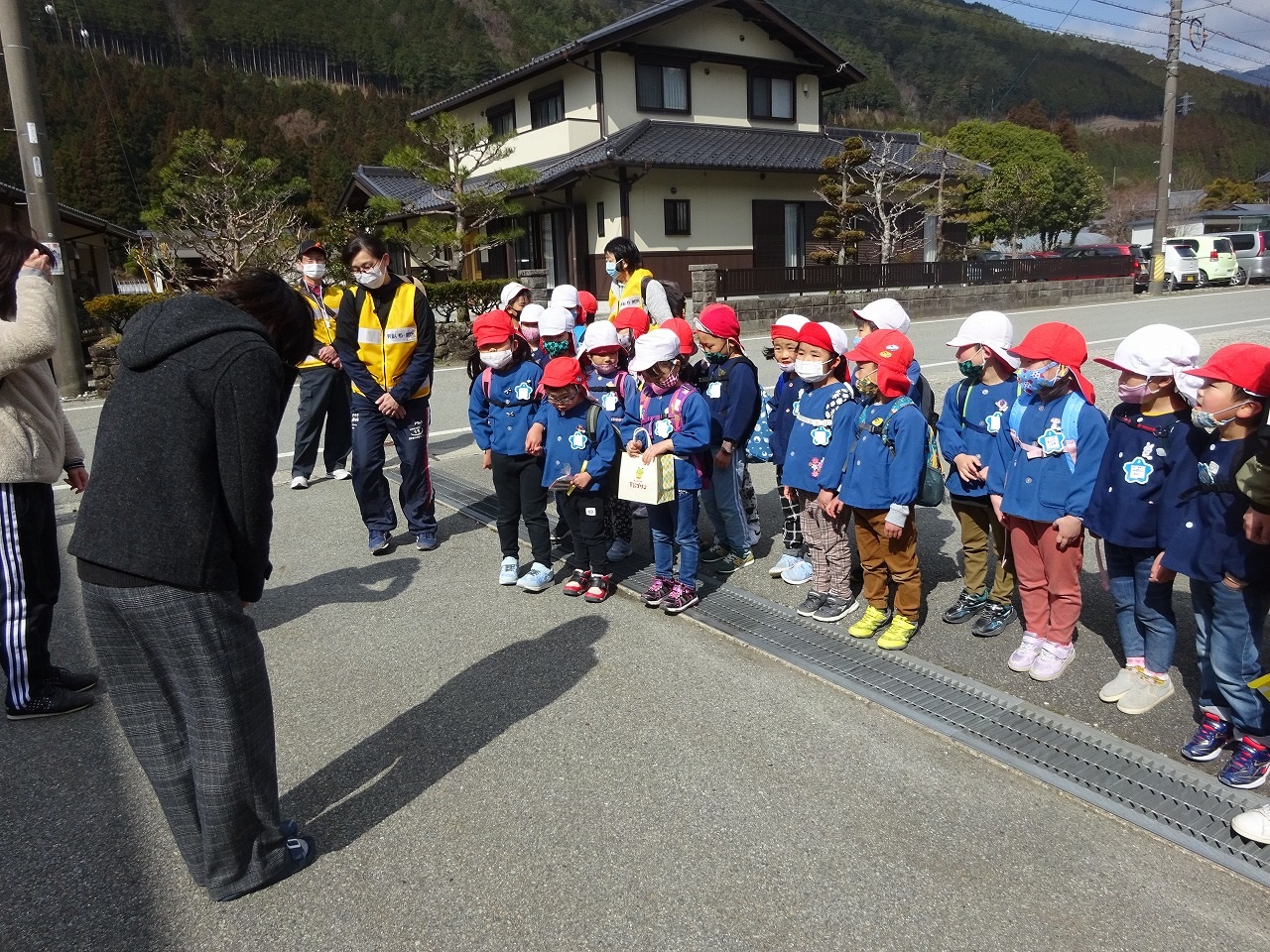全園児が園庭に集まり、年中さんの進行でおわかれ会を行いました。年少さんの可愛い「さんぽ」のうた、年中さんの「ウンタカダンス」、年長さんの「一緒にいこう」の踊り、どれもいつの間に練習したのかびっくりするくらいすばらしい出し物でした。 |