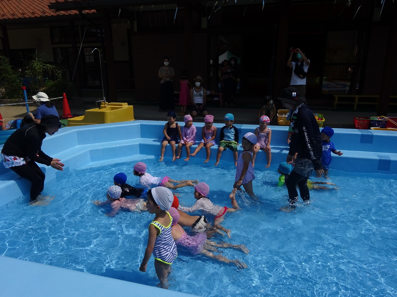 今年度は参観される方が密にならないようにプール参観を3日間行いました。7月は雨が続きなかなかプールに入ることができませんでしたが、参観3日間は大変良い天気に恵まれました。プールに入っている子どもたちは気持ち良かったですが、観に来てくださった方には申し訳ないくらいの暑さでした。 |