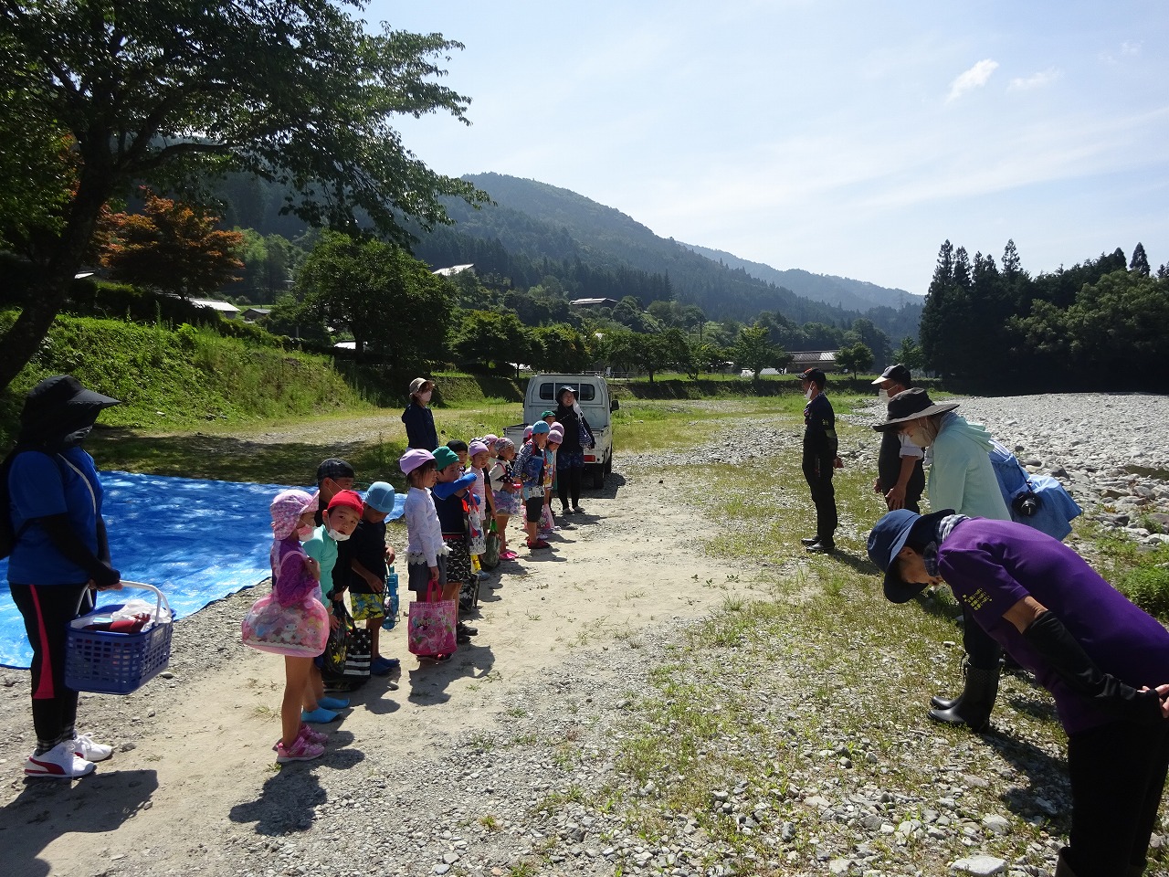 絶好の川あそび日和になりました。先日の川あそびが雨で実施できず、とても残念がっていた年長さん。今日は川あそびを楽しみに元気いっぱい登園してきました。 |