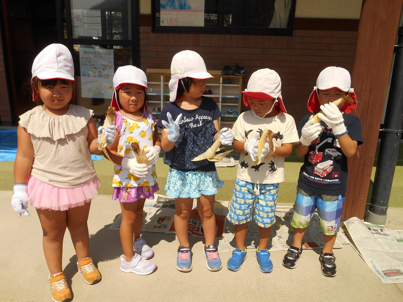 春に畑に種を植え、水やりをして育ててきたポップコーン用のトウモロコシの収穫をしました。子どもたちの身長をはるかに超える身長になったトウモロコシですが、今年は天候不順のせいで歯抜け状態のものが多かったようです。 |