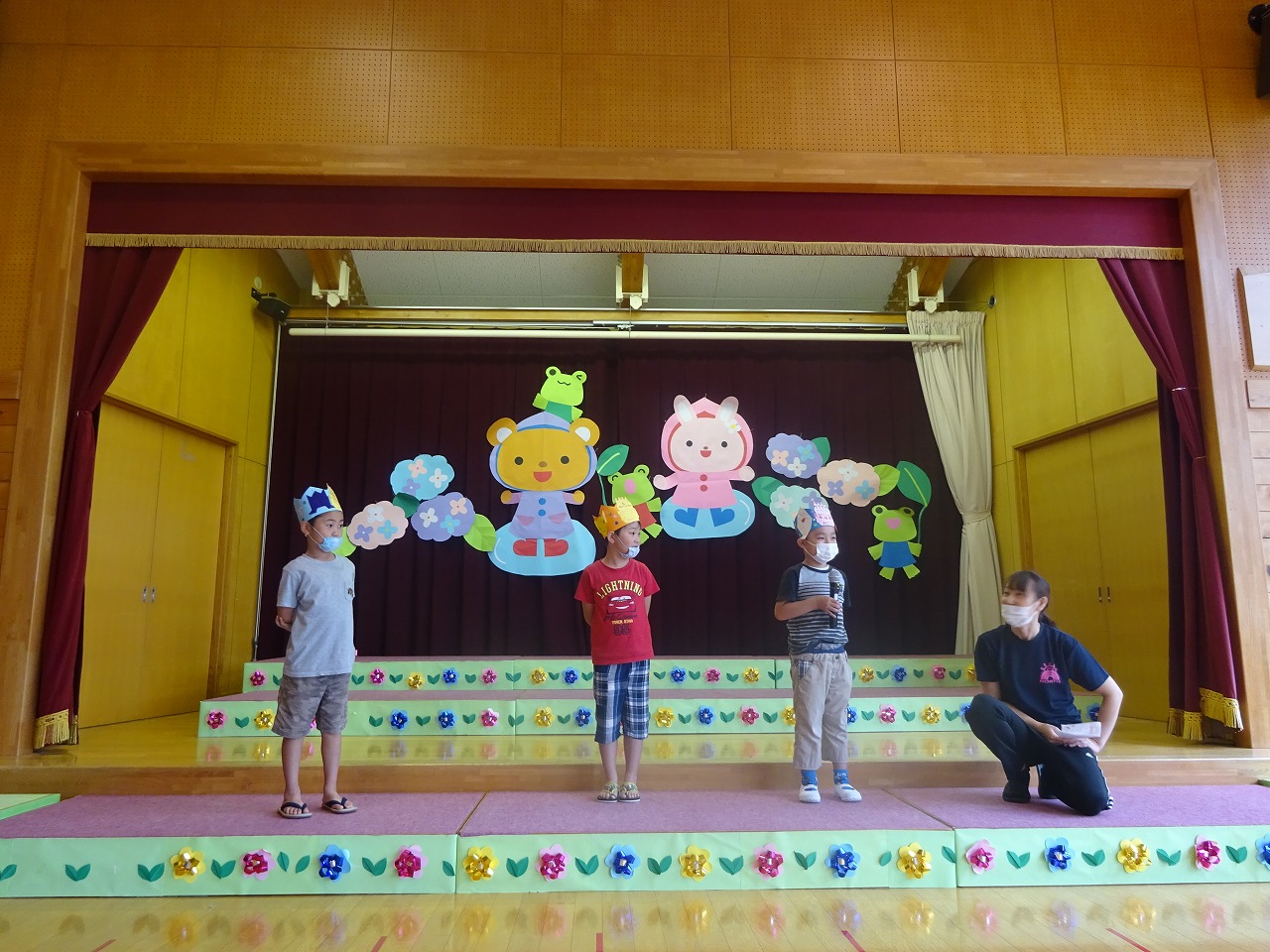 今年度はじめての誕生会。4月、5月、6月生まれのお友だちのお祝いをしました。順番に「お名前は?」「いくつになったの?」「大きくなったら何になるの?」とお客さんからインタビューされ、元気に答えてくれました。一人で言うのがちょっと恥ずかしい子は、保育士と一緒に言いました。。 |