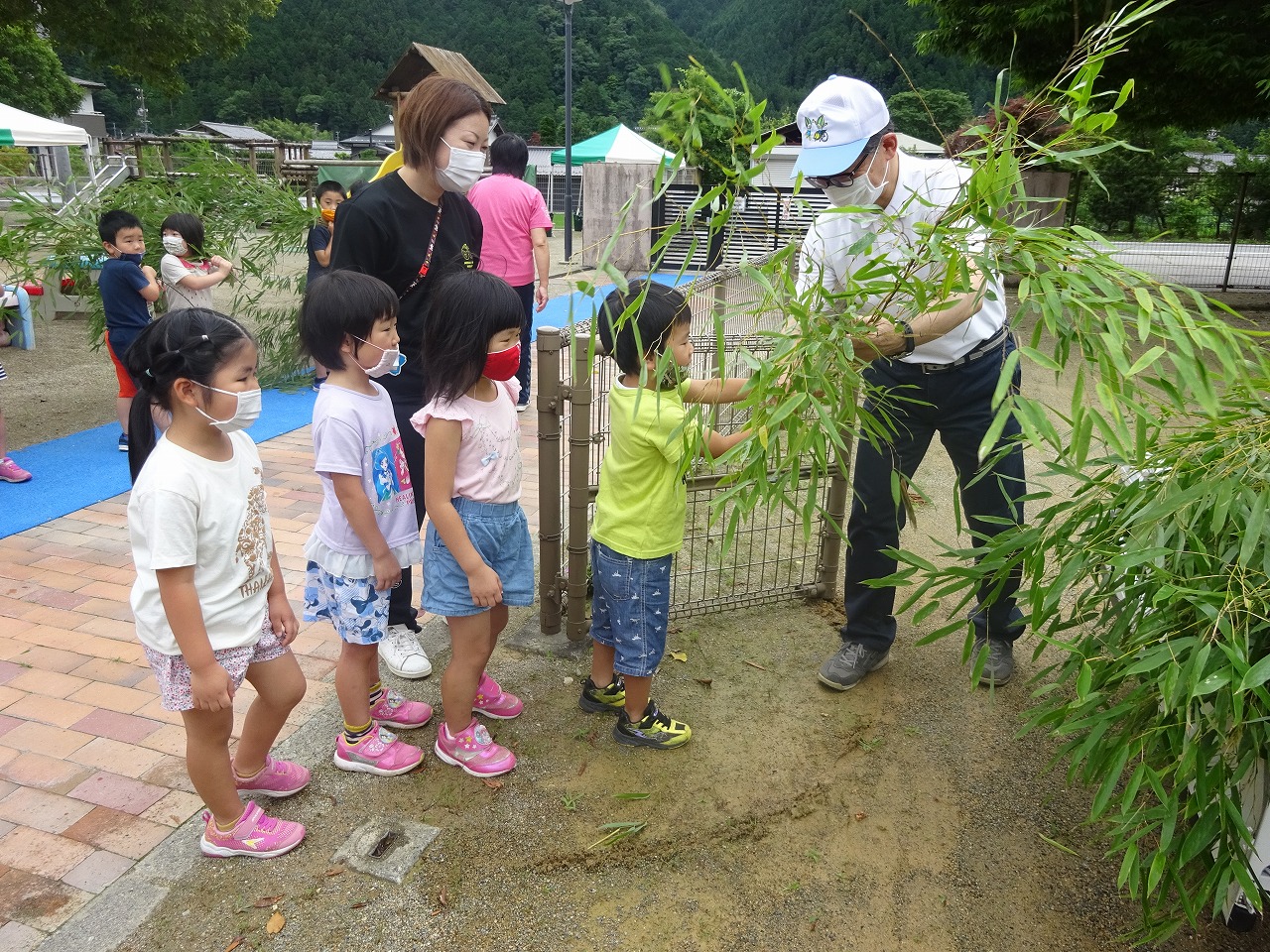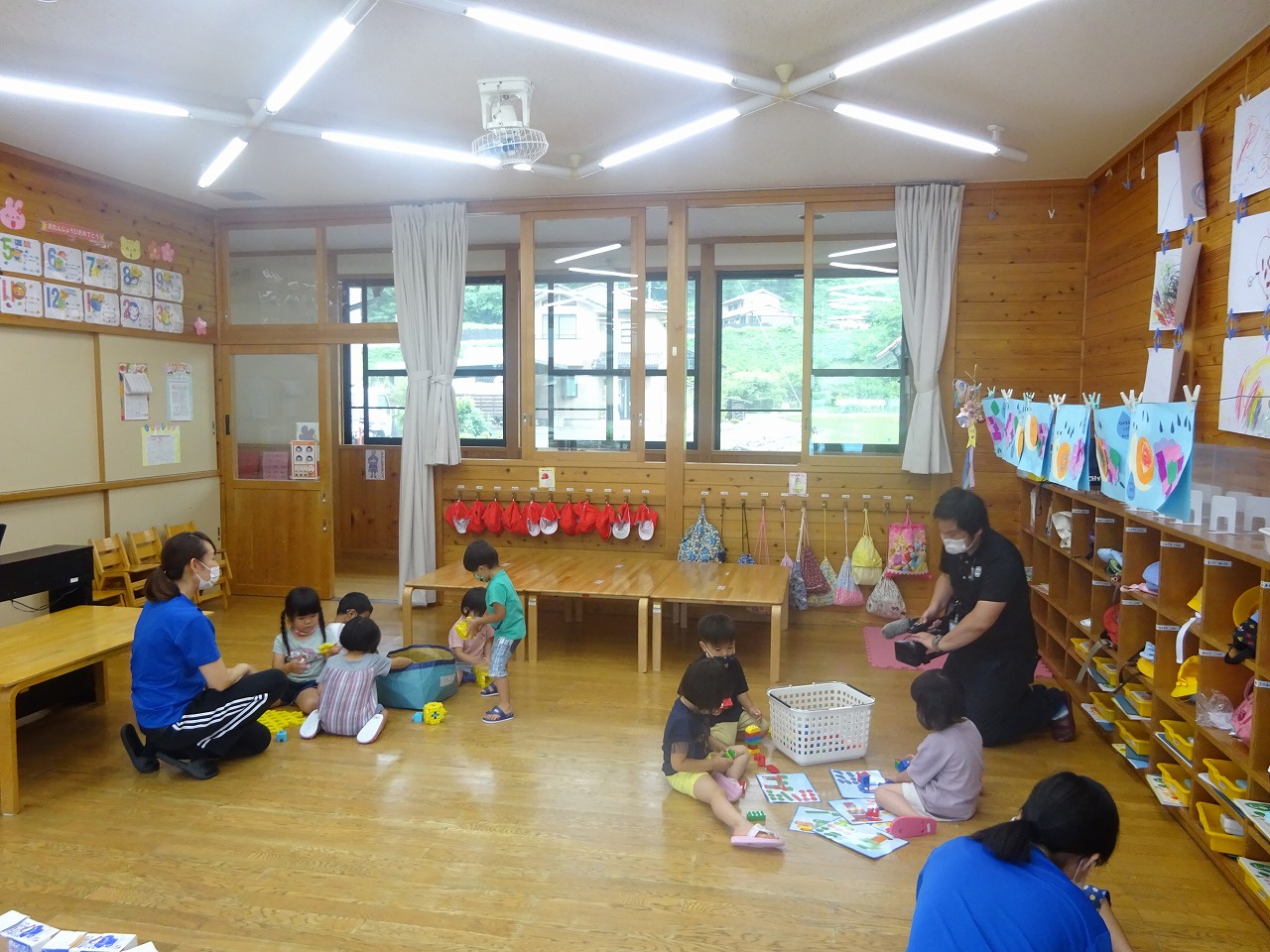 年中さんは、遊戯室で大型絵本を見る様子と、給食の様子を撮ってもらいました。 |