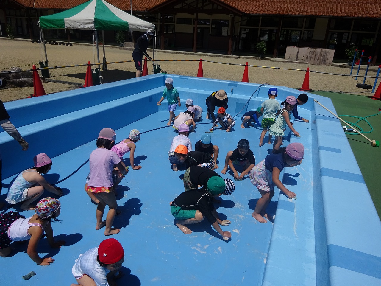 良い天気の下、7月からのプールあそびに向け、年長さんがプール掃除をしてくれました。 |