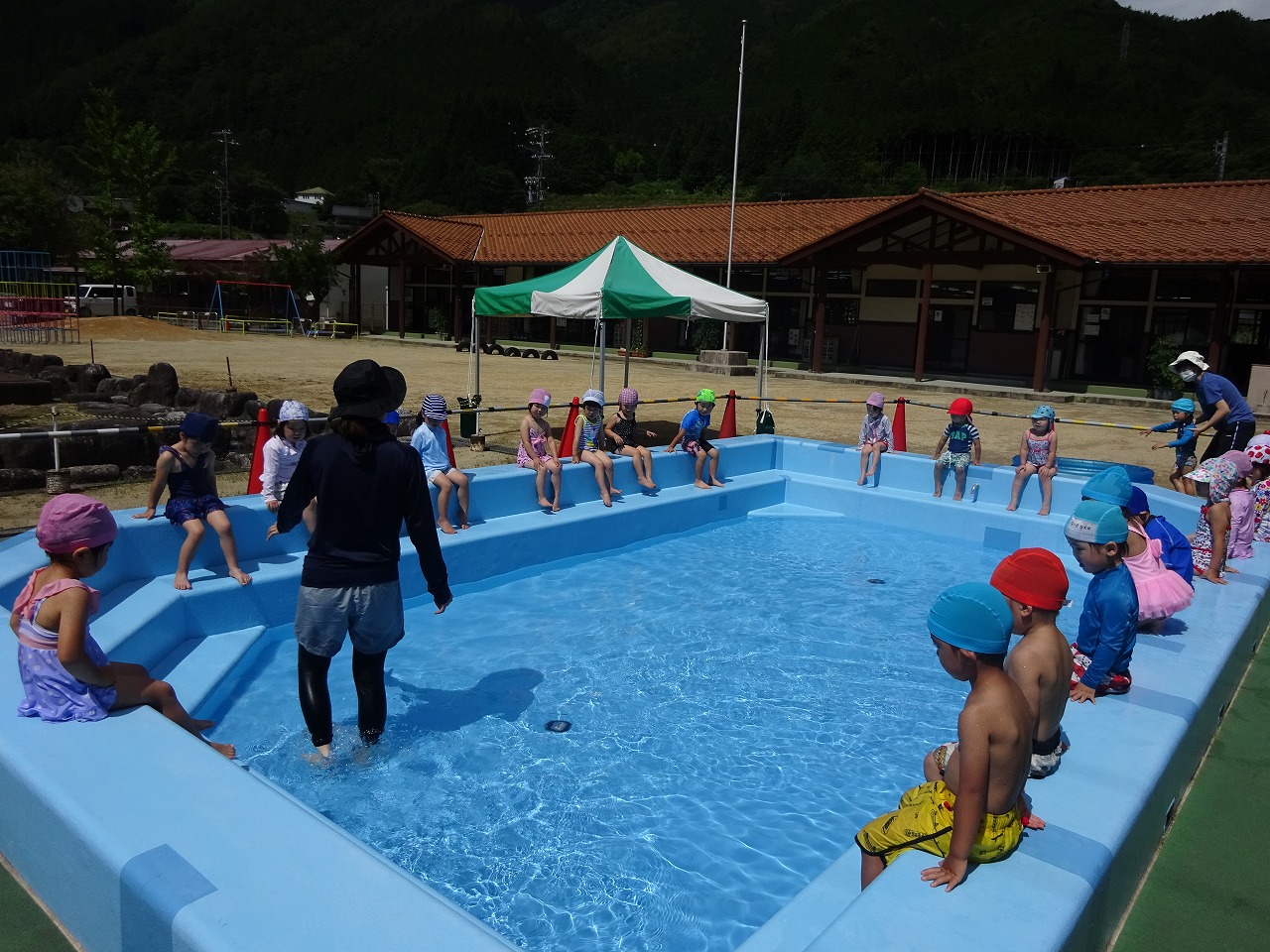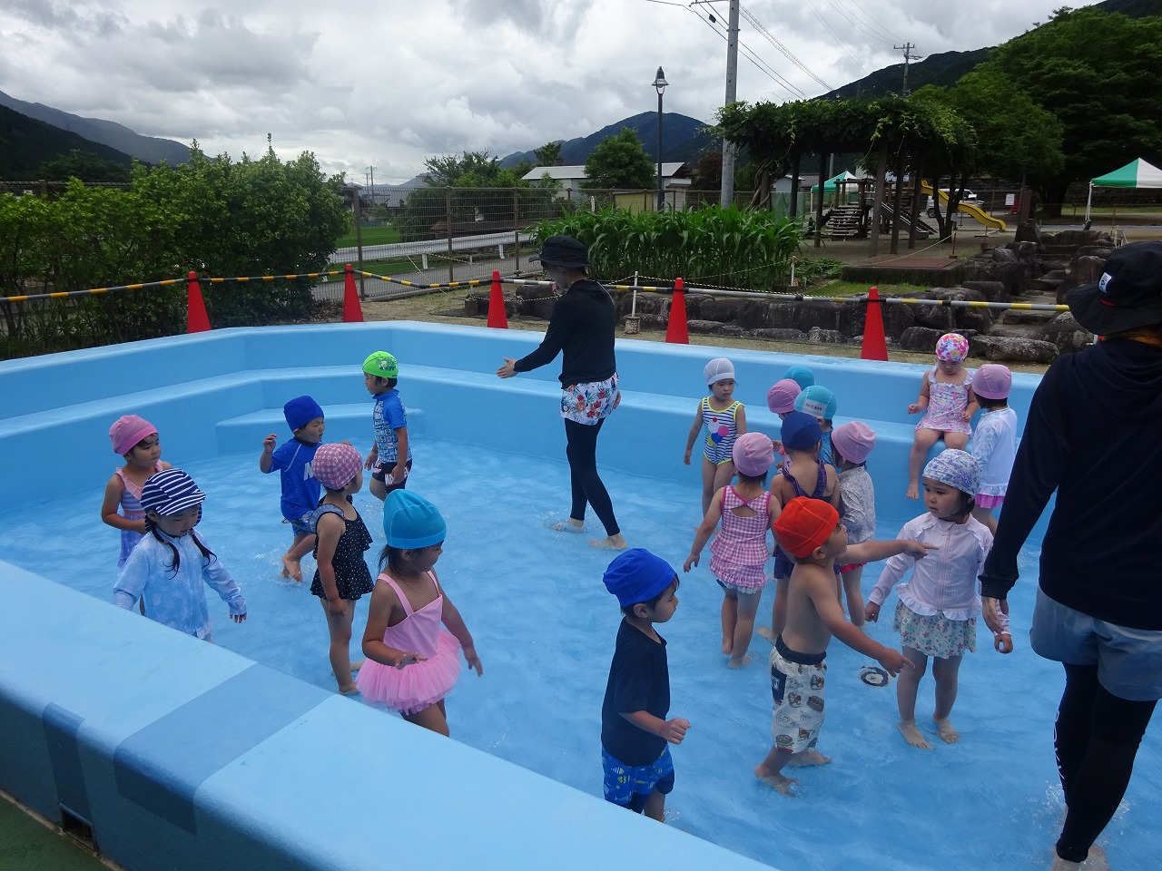 やっと晴れてくれました。前回のプールは少し肌寒い日でしたが、今日は日差しがあり、とても気持ちの良いプールあそびとなりました。 |