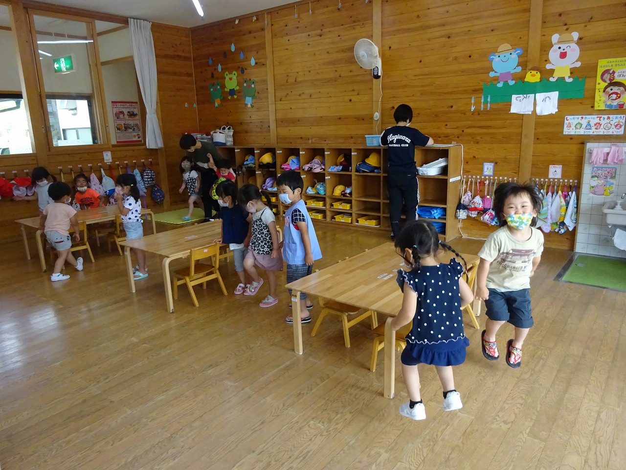 今日から22人全員揃うということで、嬉しそうに登園してくる子どもたち。感染予防をしながらの新しい生活スタイルも分散登園中に身につけ、自分たちで気づいて声をかけ合う姿も見られます。 |