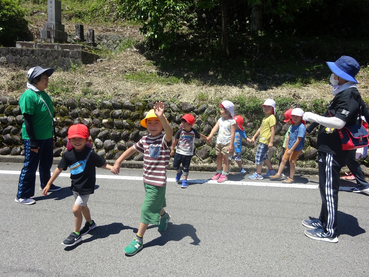年少さん、年中さん、年長さんで散歩に出かけました。行き先は、すぐ近くの野上公民館の広場です。 |
