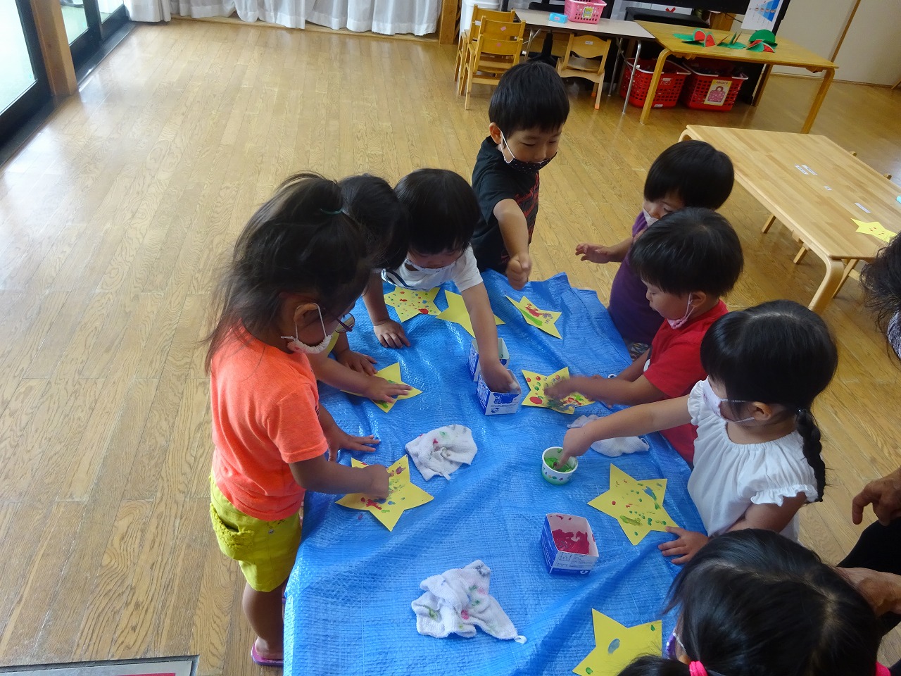 休み明けもみんな元気に登園してくれました。部屋で七夕の笹飾りを作ったあとは、お楽しみの外あそび。 |