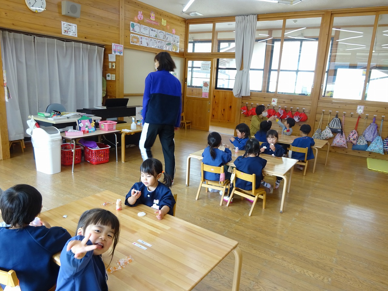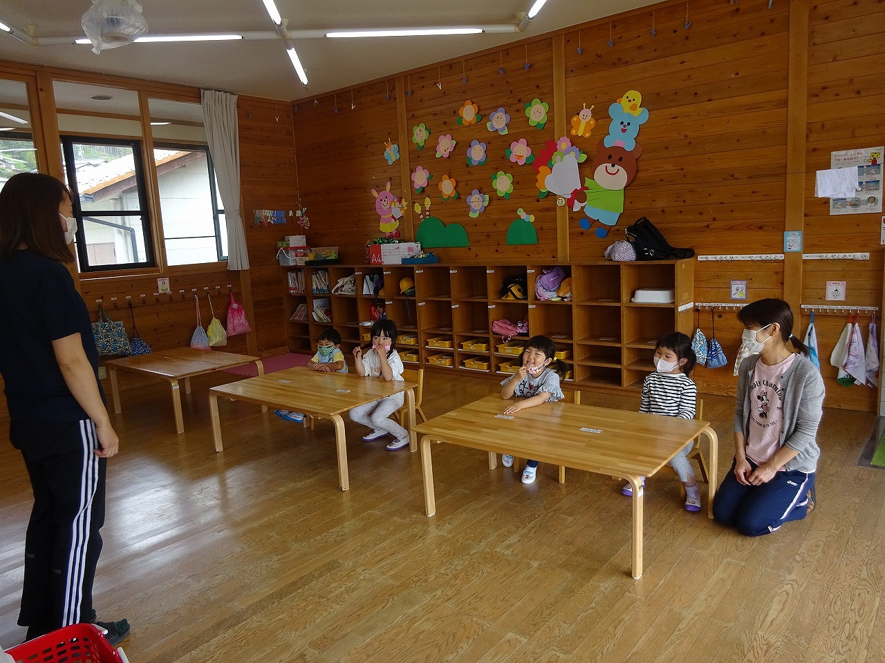 今日から分散登園が始まりました。久しぶりにこども園じゅうに子どもたちの声が響きわたり、保育士も一気に元気が湧いてきました。手指の消毒を徹底したり、トイレなど密にならないように時間差で行ったりと、できる範囲で感染対策に努めながら過ごしています。 |