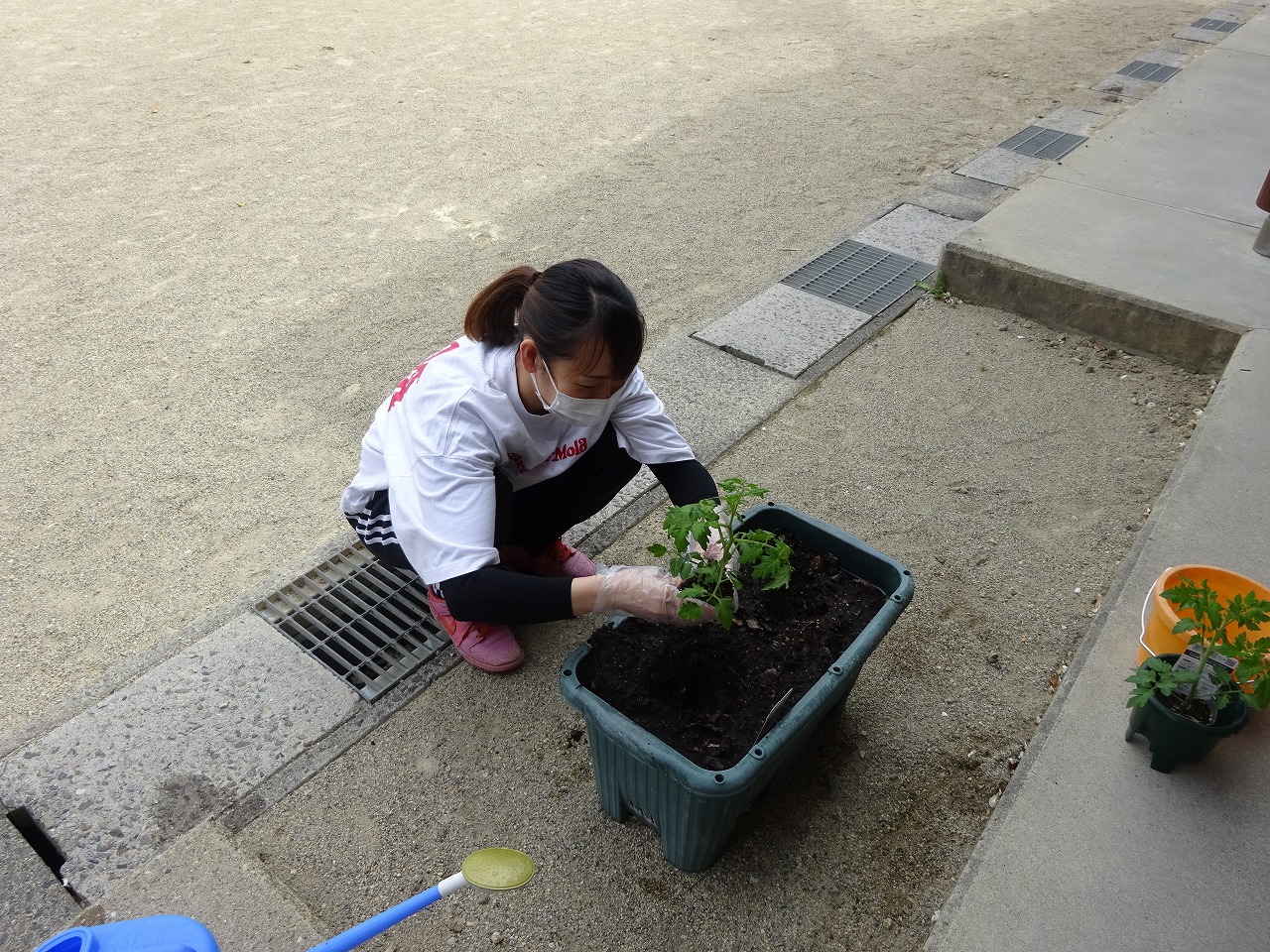年少さんと年長さんの先生が、ミニトマトの苗植えをしました。本当はみんなと一緒にできると良かったのですが休園中ということで、先生たちが植えました。 |