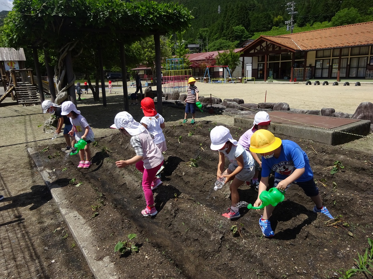 先日耕した園の畑には草が生えてしまい、もう一度耕してからさつま芋の苗を植えました。ポップコーン用のトウモロコシはたくさん芽を出し、すくすくと生長していますよ。 |