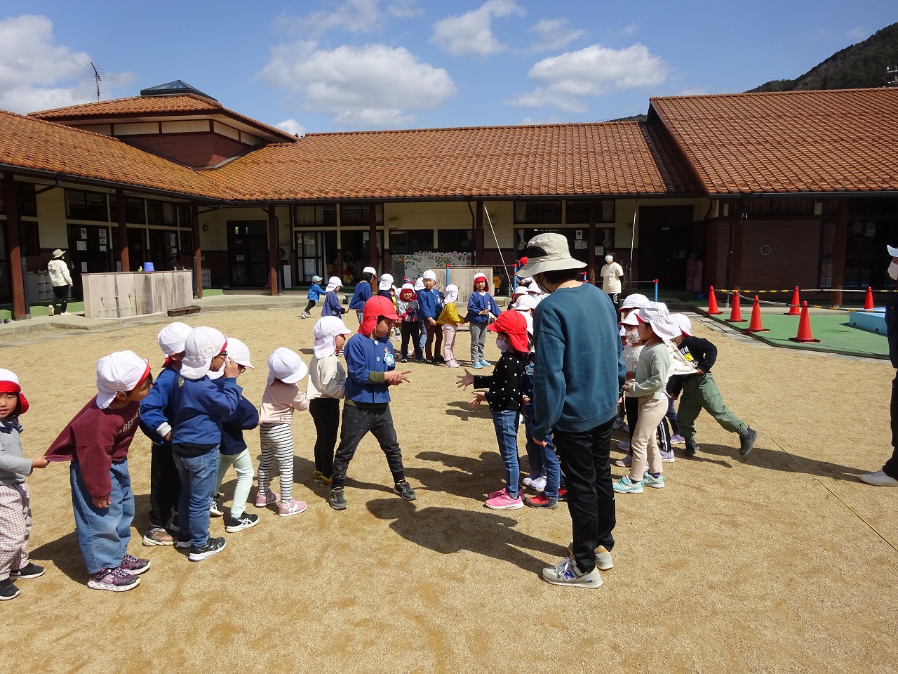 いいお天気のもと全園児が園庭に集まり新しいお友達の歓迎会を行いました。 |